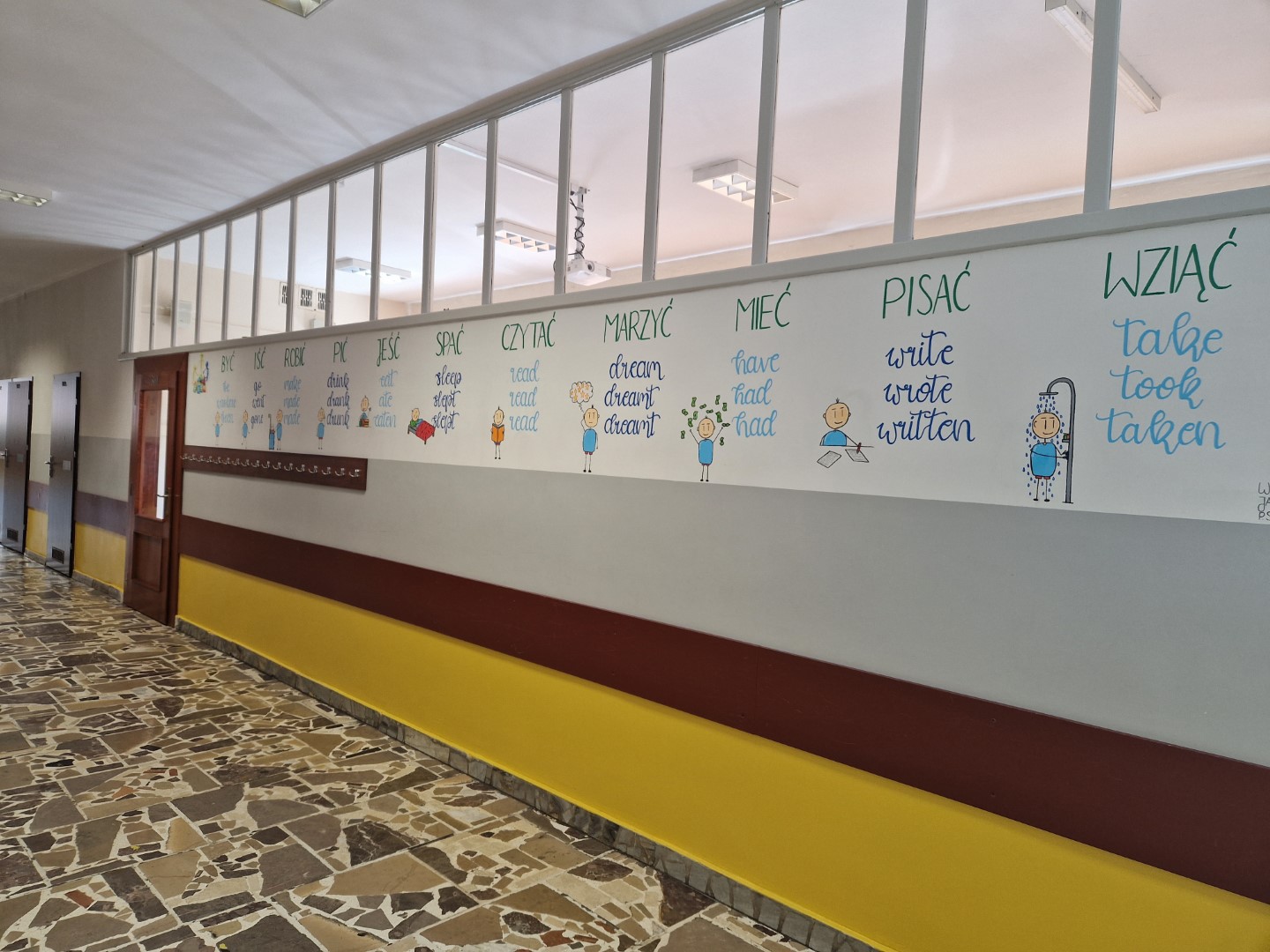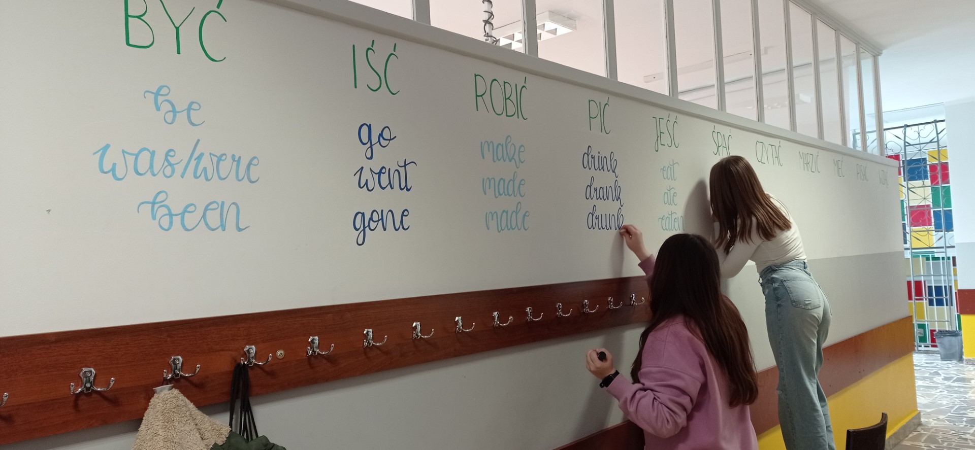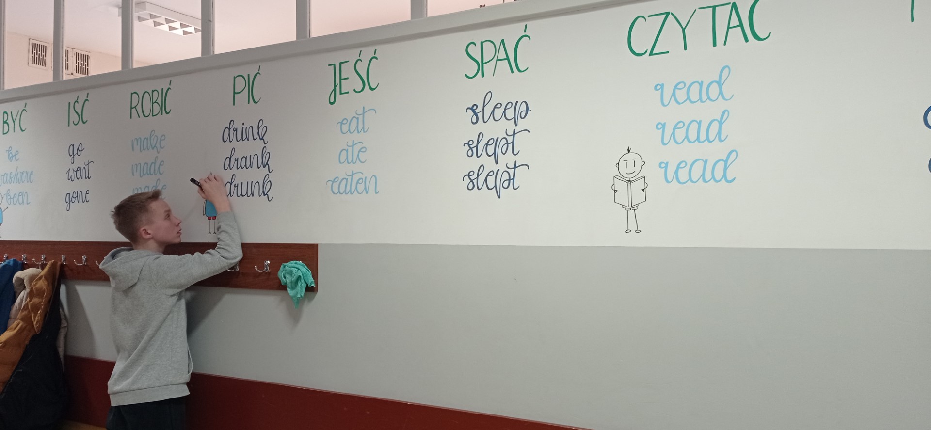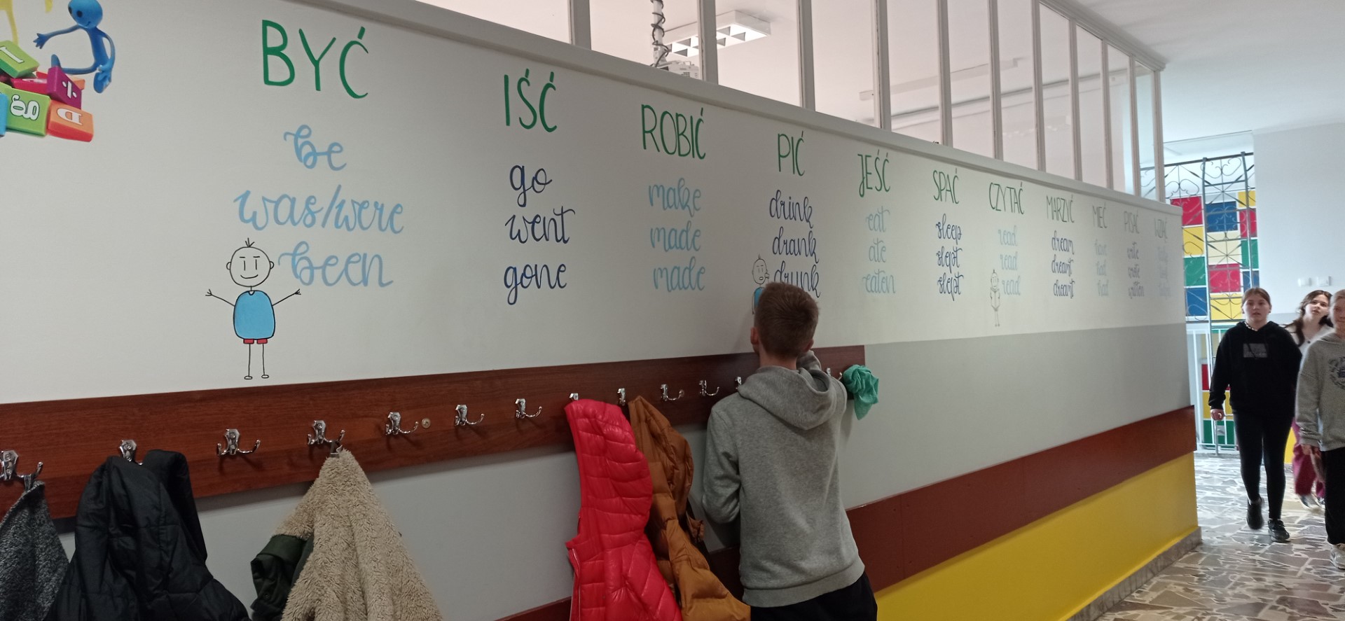 W ostatnim czasie w naszej szkole pracowaliśmy nad plastycznym projektem. Jego przygotowaniem zajęli się nasi uzdolnieni uczniowie z klasy 8c: Wiktoria Szulc i Jan Jakubowski. Przyszli Absolwenci przygotowali w formie muralu zagadnienie gramatyczne – 3 formy języka angielskiego, które zwykle stanowią dla uczniów problem.