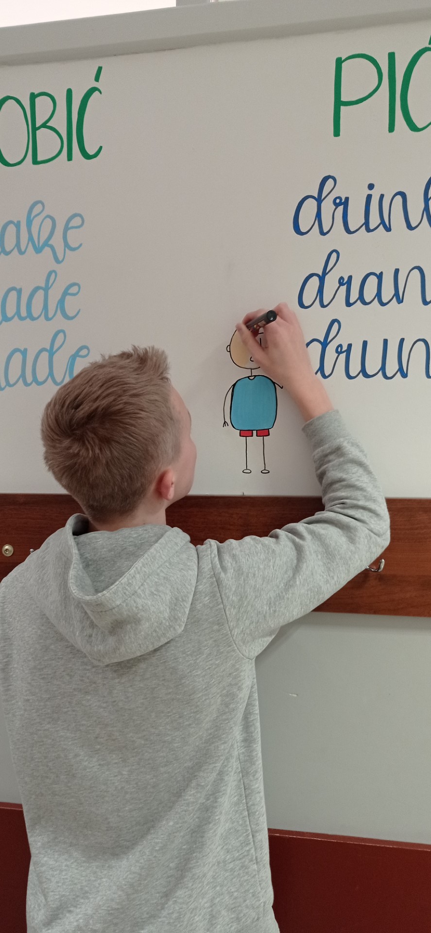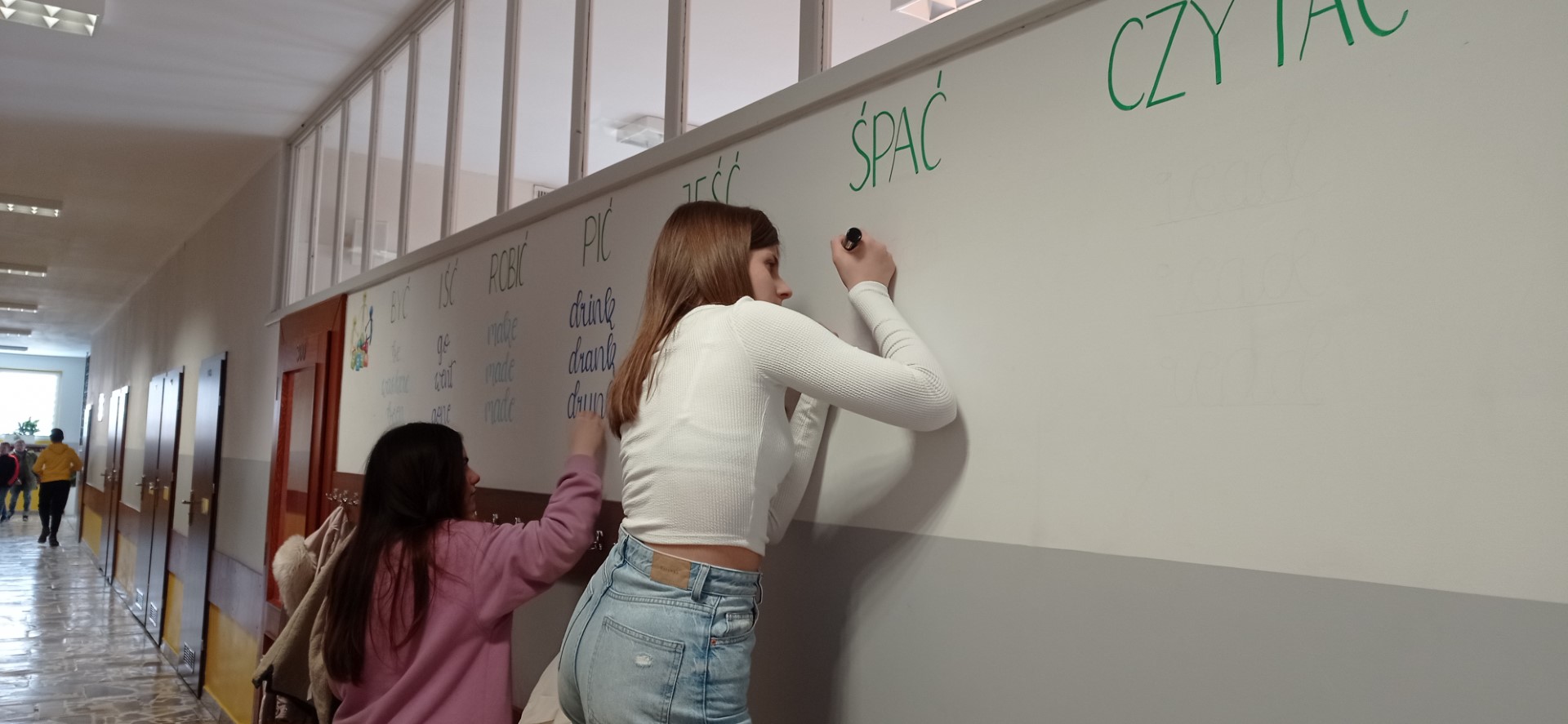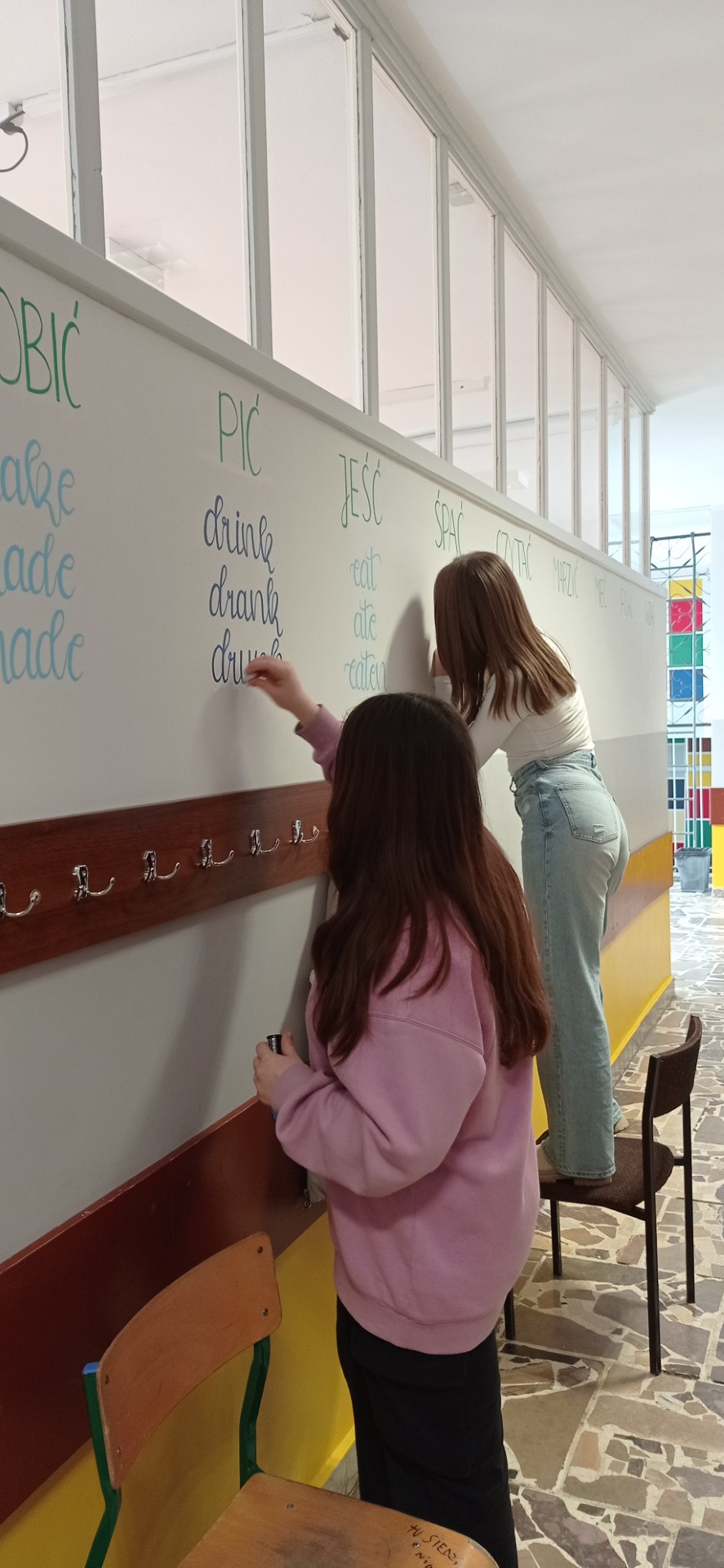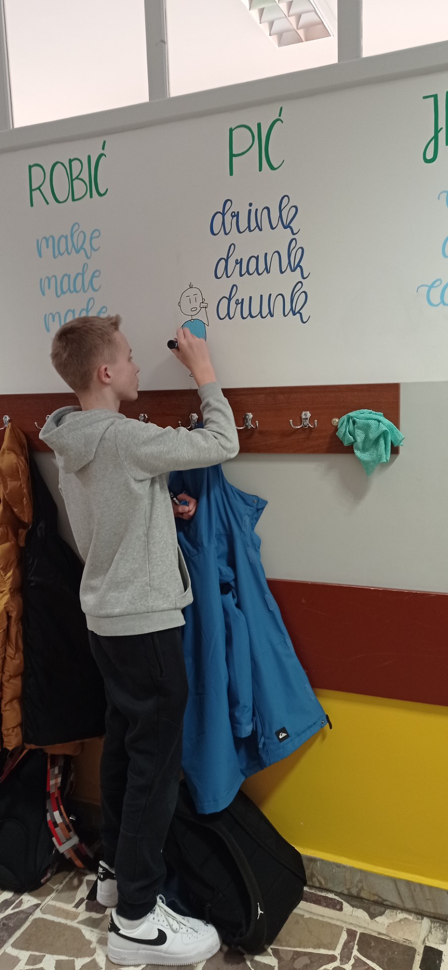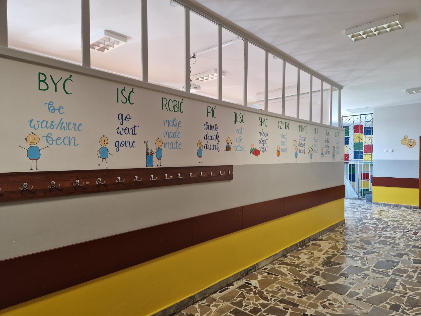 W ostatnim czasie w naszej szkole pracowaliśmy nad plastycznym projektem. Jego przygotowaniem zajęli się nasi uzdolnieni uczniowie z klasy 8c: Wiktoria Szulc i Jan Jakubowski. Przyszli Absolwenci przygotowali w formie muralu zagadnienie gramatyczne – 3 formy języka angielskiego, które zwykle stanowią dla uczniów problem.