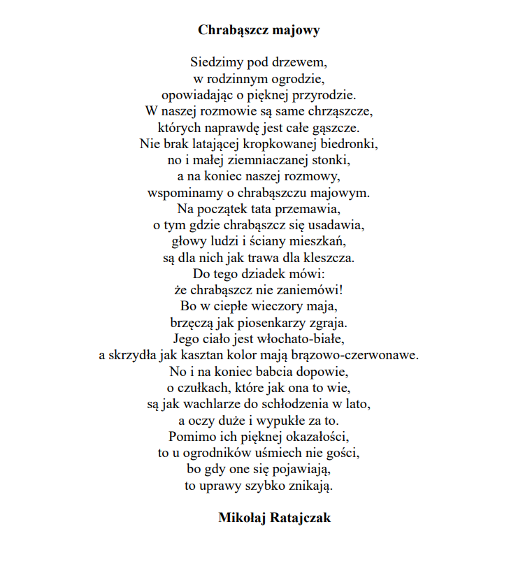 W tym konkursie w kategorii wiersz nagrodę za II miejsce otrzymał Mikołaj Ratajczak z kl.5c. Koordynatorem szkolnym konkursu była p. Maria Wolska.