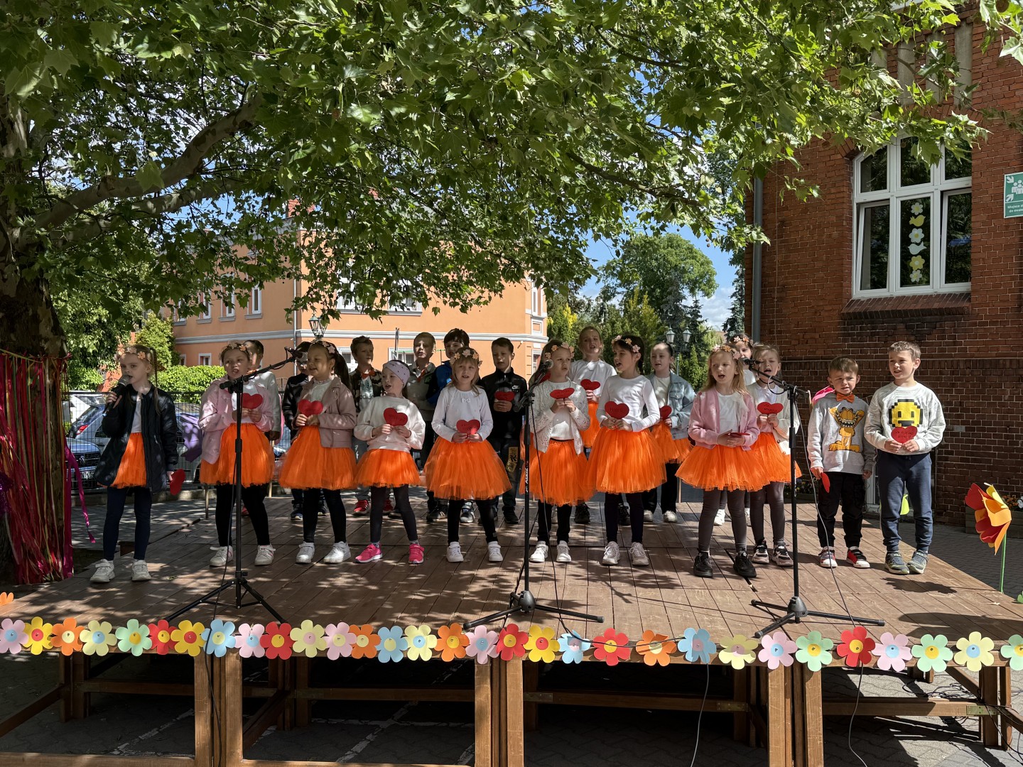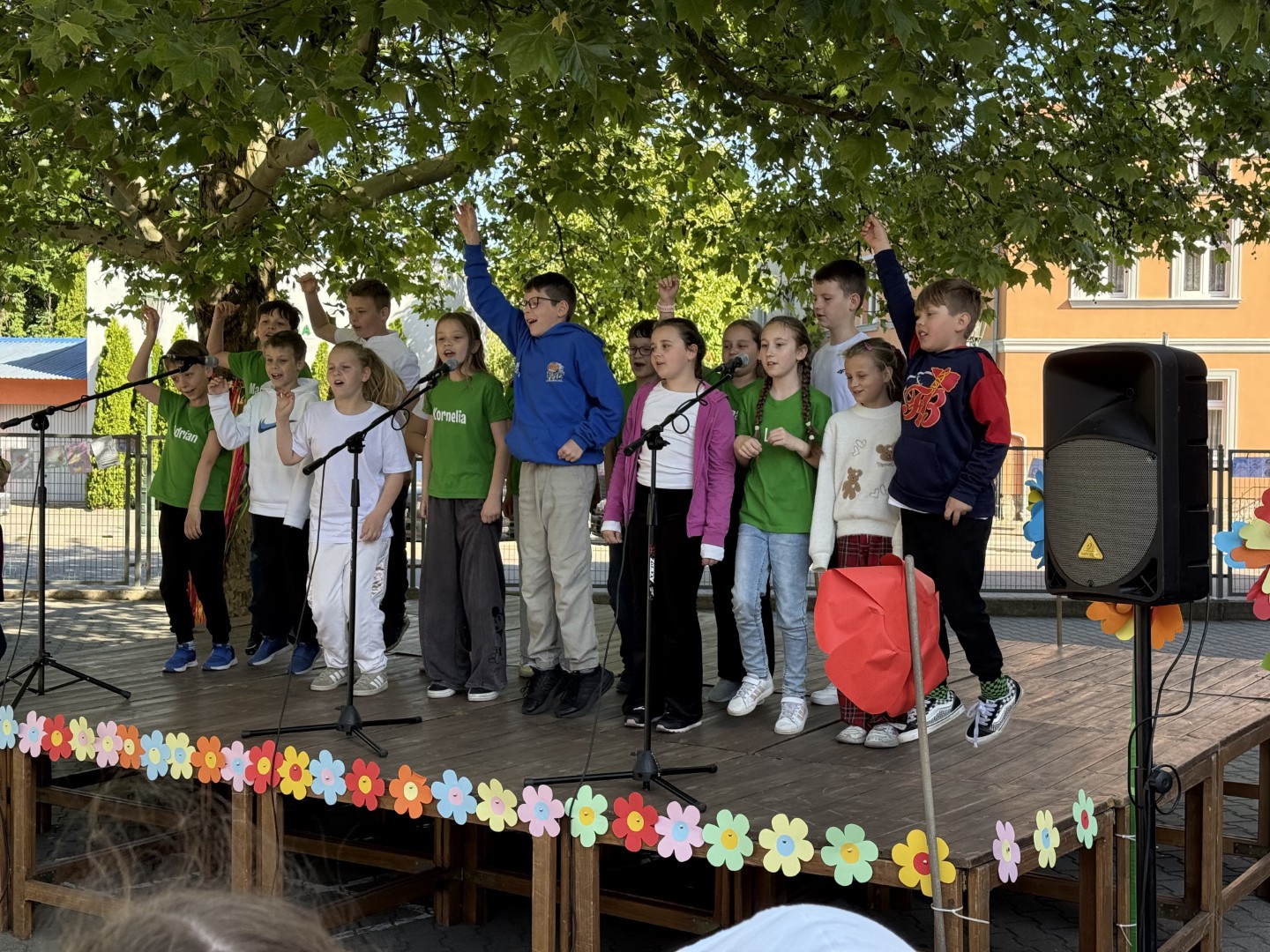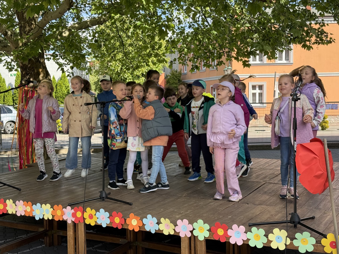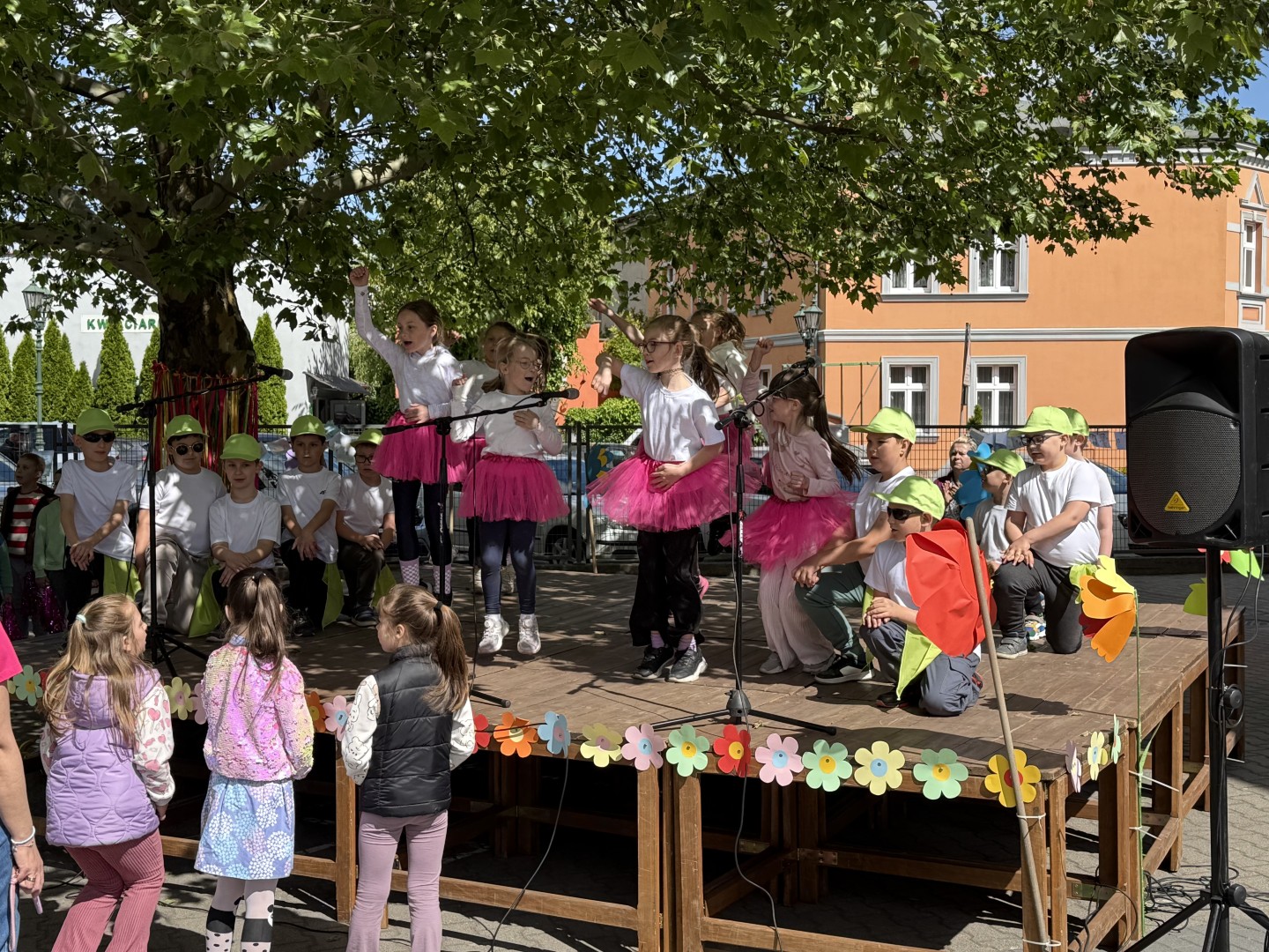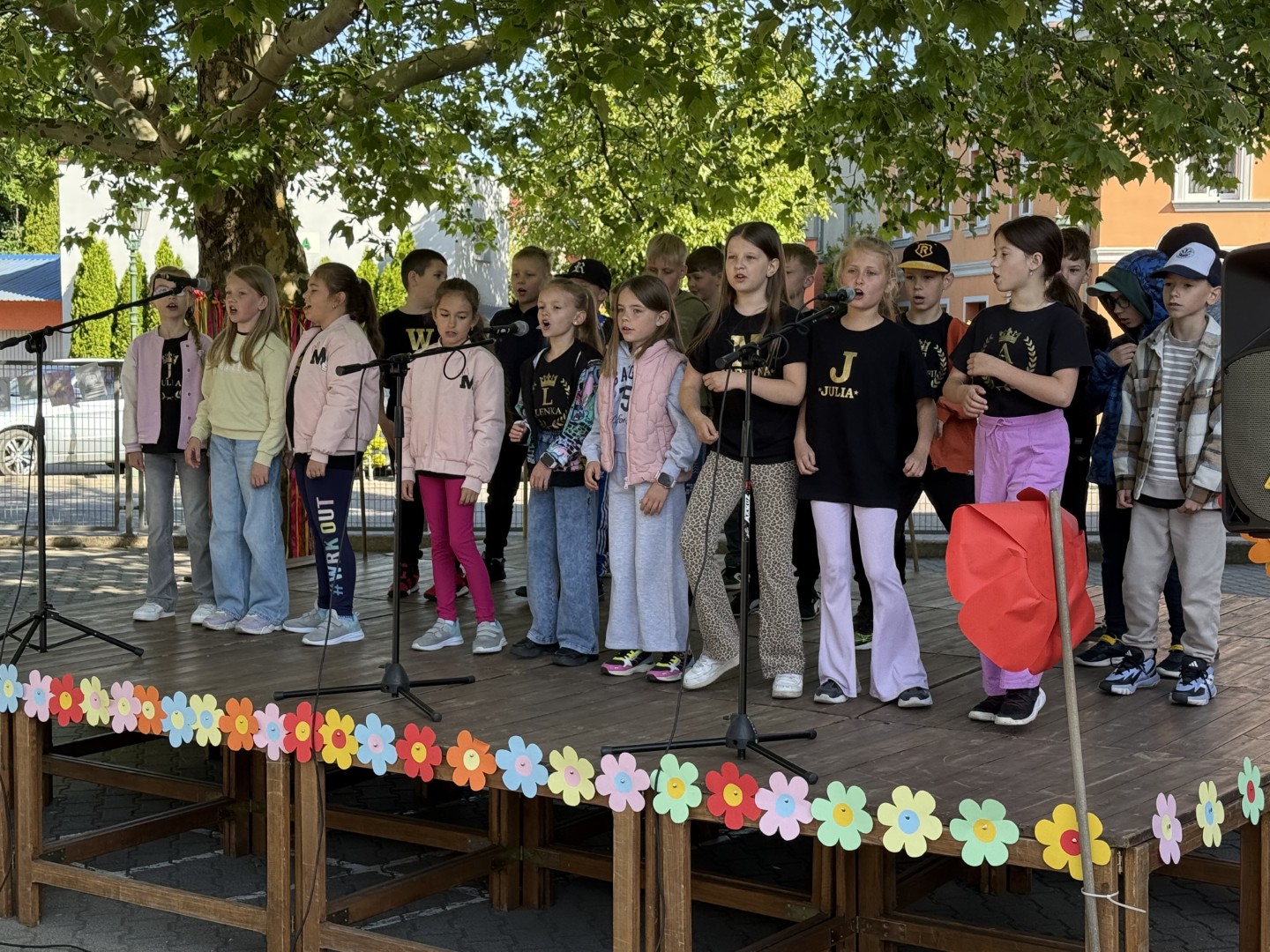 W piątek, 23.05.2025r. na podwórzu szkolnym przy Farnej pod pięknym, rozłożystym platanem stanęła scena, która stała się areną popisów wokalnych i tanecznych wszystkich klas 0-3. Zdjęcia i nagrane filmiki będą materiałem wyjściowym do stworzenia impresji filmowej – teledysku, który wkrótce sprezentujemy Rodzicom naszych Dzieci na stronie szkoły i profilu fb z okazji DNIA MAMY. Oprócz prezentacji scenicznych tego dnia Dzieci miały okazję uczestniczyć w Grze Miejskiej pod hasłem „ Opalenica w słoiku”. Zabawa polegała na znajdowaniu rozmieszczonych w ważnych miejscach naszego miasta słoików z zadaniami. Instrukcje były przeróżne i ściśle związane z odwiedzanymi miejscami. W Ratuszu np. uczniowie musieli załatwić sprawę w biurze podawczym, na Dworcu Kolejowym porozumieć się z Panią w kasie w kwestii pociągu do Warszawy. Okazało się, że policzenie okien w kościele św. Józefa było nie lada wyzwaniem, a niektórzy młodzi mieszkańcy naszego miasta pierwszy raz przechodzili przez kładkę przerzuconą przez Mogilnicę w okolicach Kolorowego Zamku. Śmiechu, zabawy, zaskoczeń było całe mnóstwo. Po powrocie do szkoły wszyscy raczyli się watą cukrową. Dziękujemy wszystkim, dzięki którym ten dzień był tak wyjątkowy.