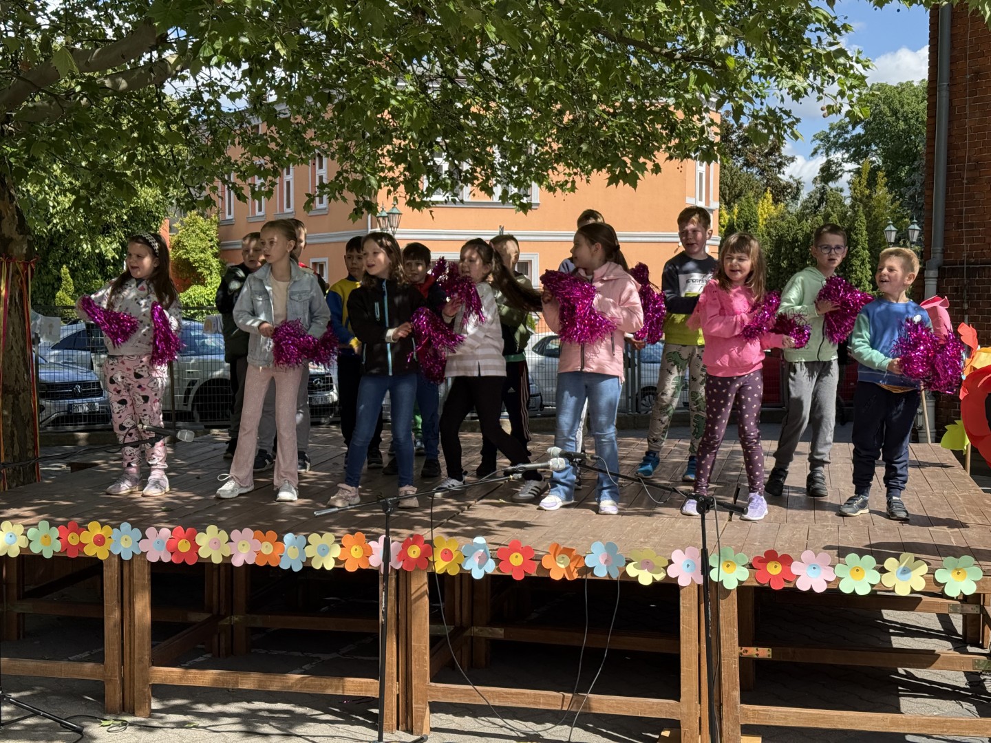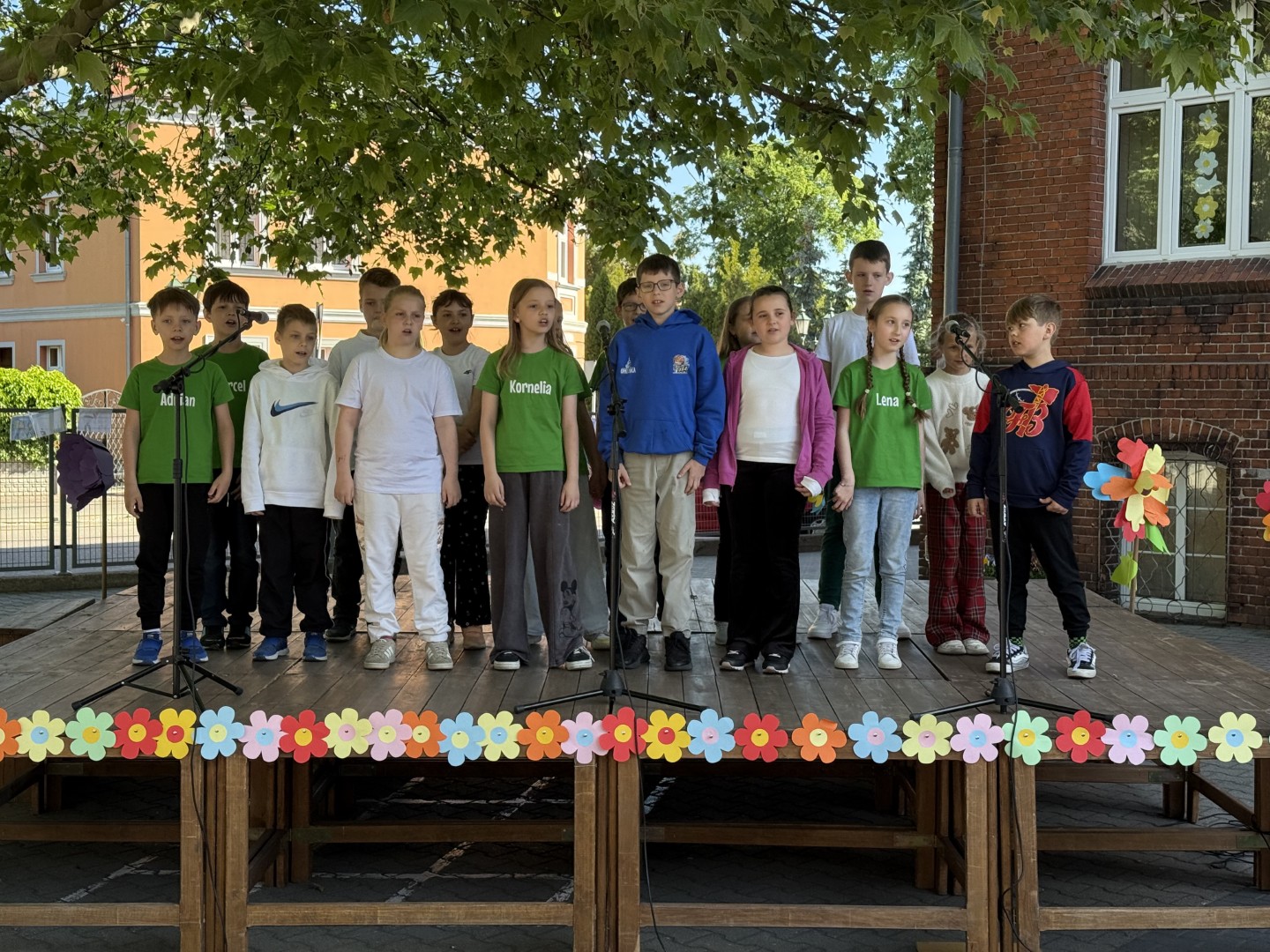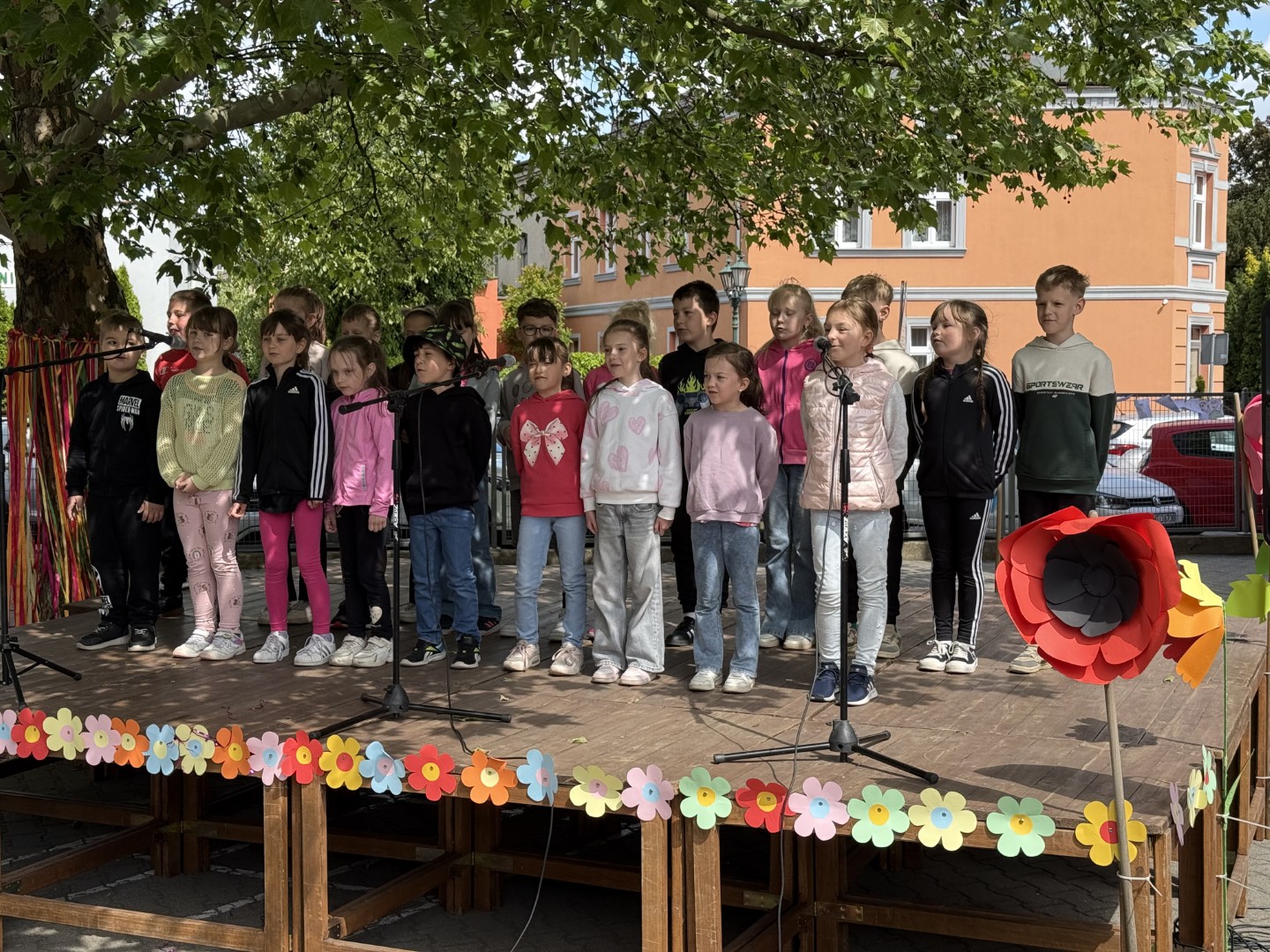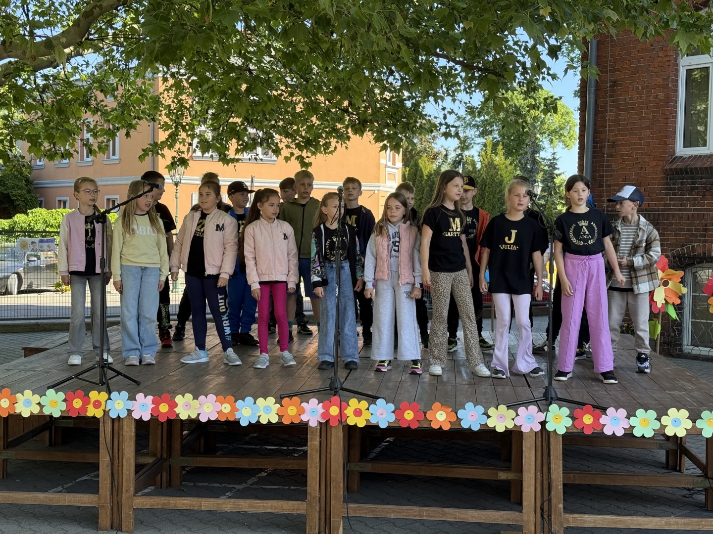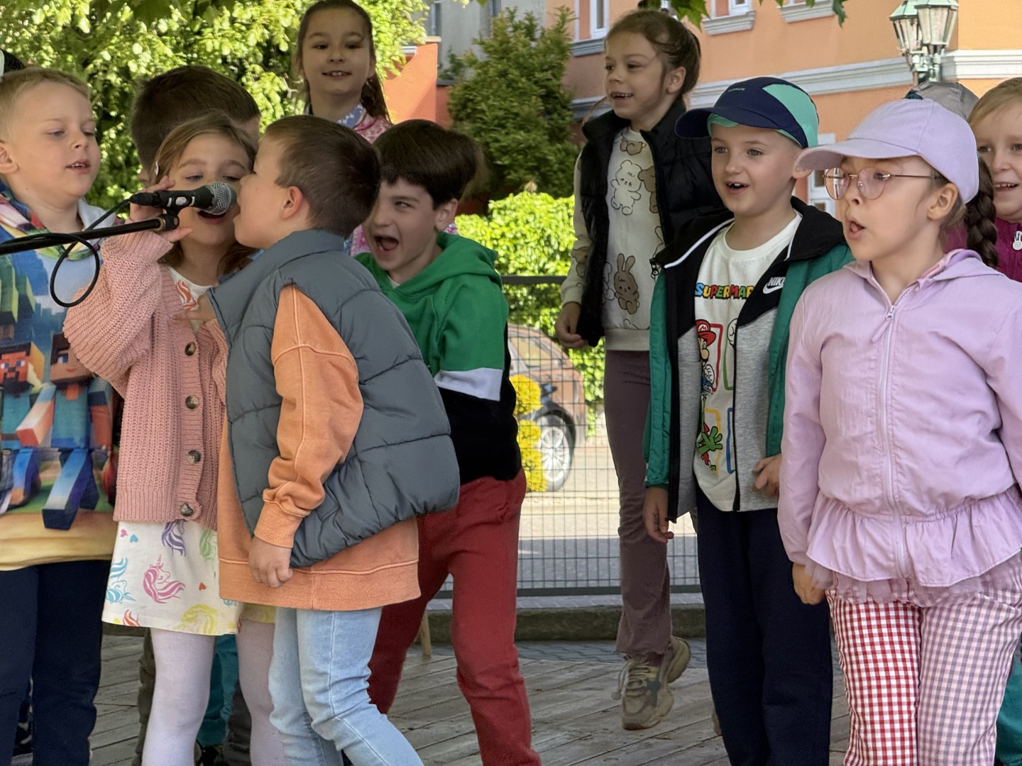 W piątek, 23.05.2025r. na podwórzu szkolnym przy Farnej pod pięknym, rozłożystym platanem stanęła scena, która stała się areną popisów wokalnych i tanecznych wszystkich klas 0-3. Zdjęcia i nagrane filmiki będą materiałem wyjściowym do stworzenia impresji filmowej – teledysku, który wkrótce sprezentujemy Rodzicom naszych Dzieci na stronie szkoły i profilu fb z okazji DNIA MAMY. Oprócz prezentacji scenicznych tego dnia Dzieci miały okazję uczestniczyć w Grze Miejskiej pod hasłem „ Opalenica w słoiku”. Zabawa polegała na znajdowaniu rozmieszczonych w ważnych miejscach naszego miasta słoików z zadaniami. Instrukcje były przeróżne i ściśle związane z odwiedzanymi miejscami. W Ratuszu np. uczniowie musieli załatwić sprawę w biurze podawczym, na Dworcu Kolejowym porozumieć się z Panią w kasie w kwestii pociągu do Warszawy. Okazało się, że policzenie okien w kościele św. Józefa było nie lada wyzwaniem, a niektórzy młodzi mieszkańcy naszego miasta pierwszy raz przechodzili przez kładkę przerzuconą przez Mogilnicę w okolicach Kolorowego Zamku. Śmiechu, zabawy, zaskoczeń było całe mnóstwo. Po powrocie do szkoły wszyscy raczyli się watą cukrową. Dziękujemy wszystkim, dzięki którym ten dzień był tak wyjątkowy.