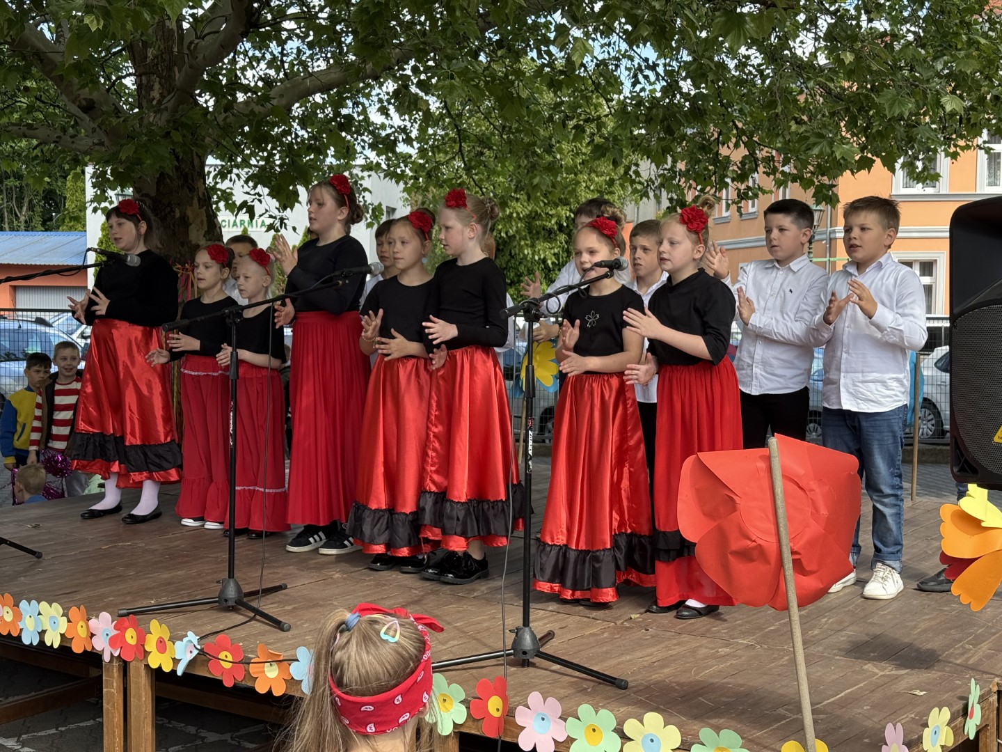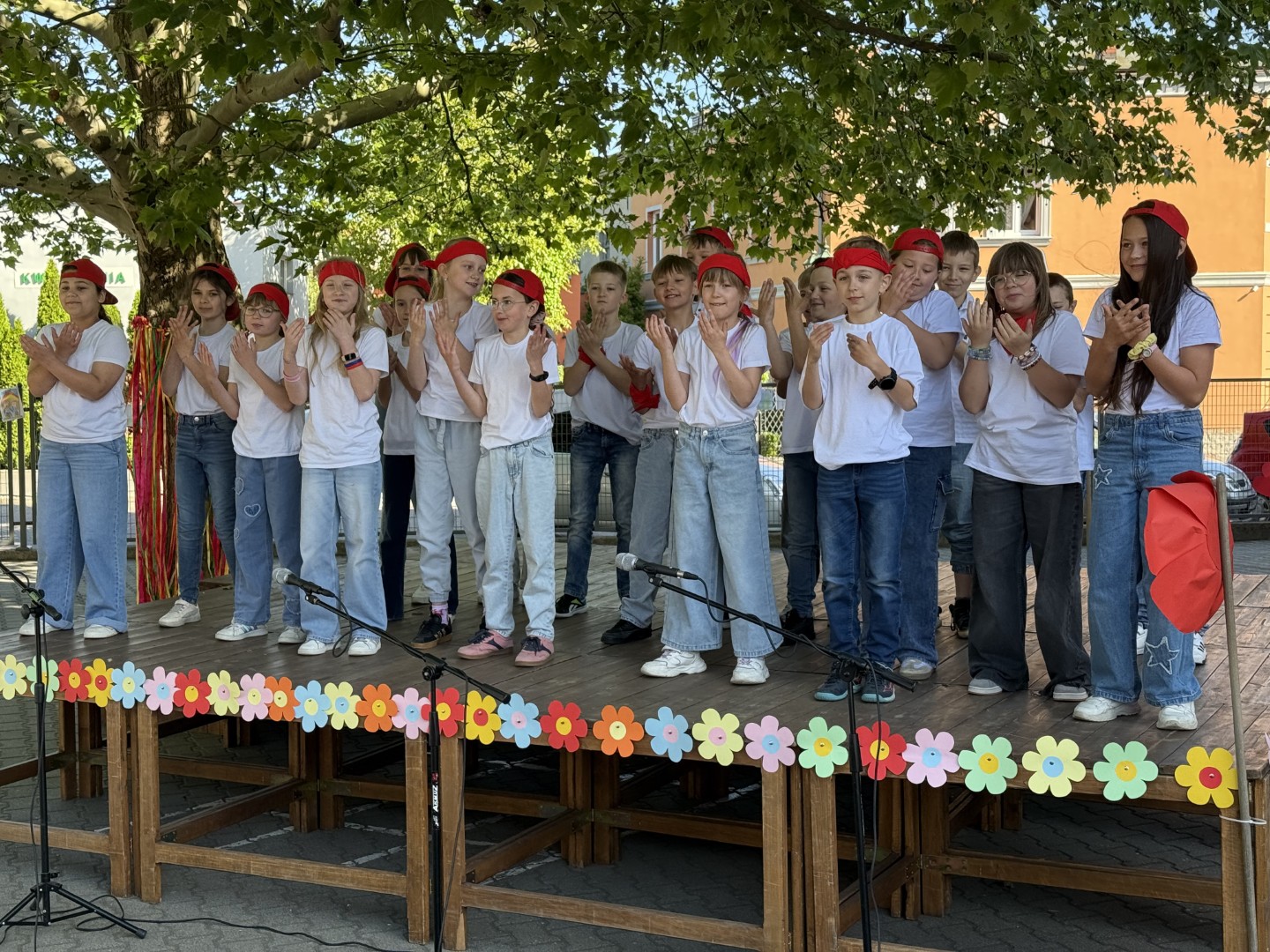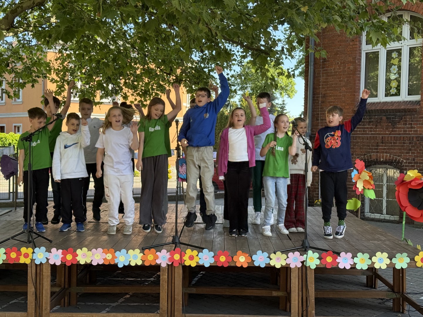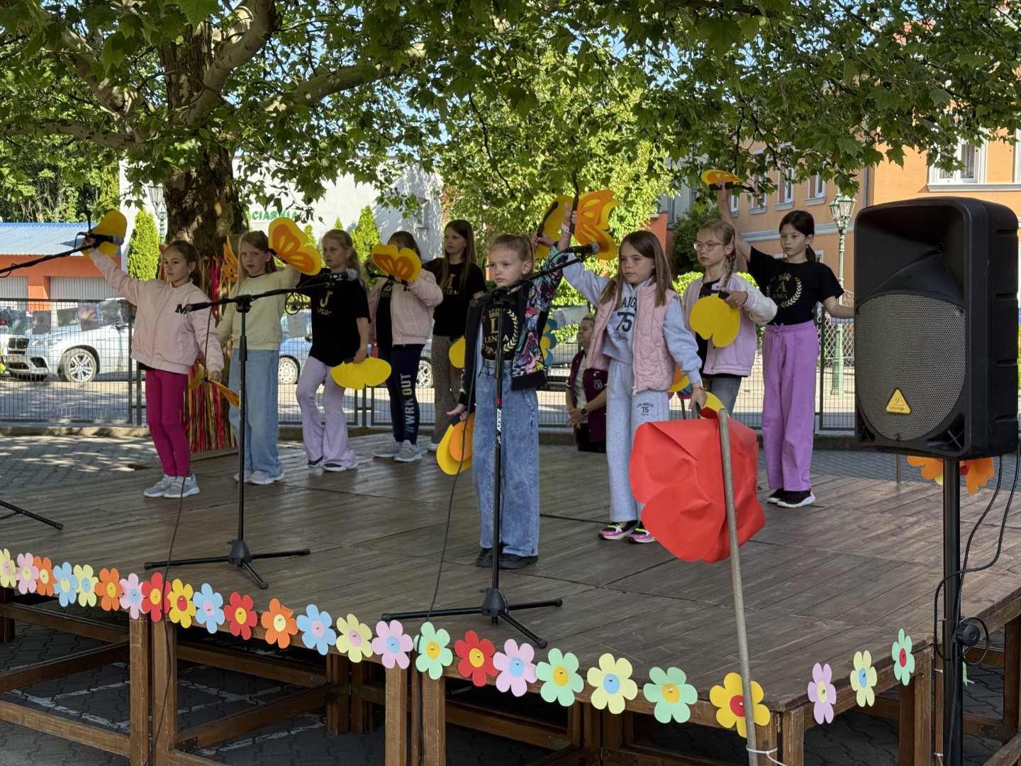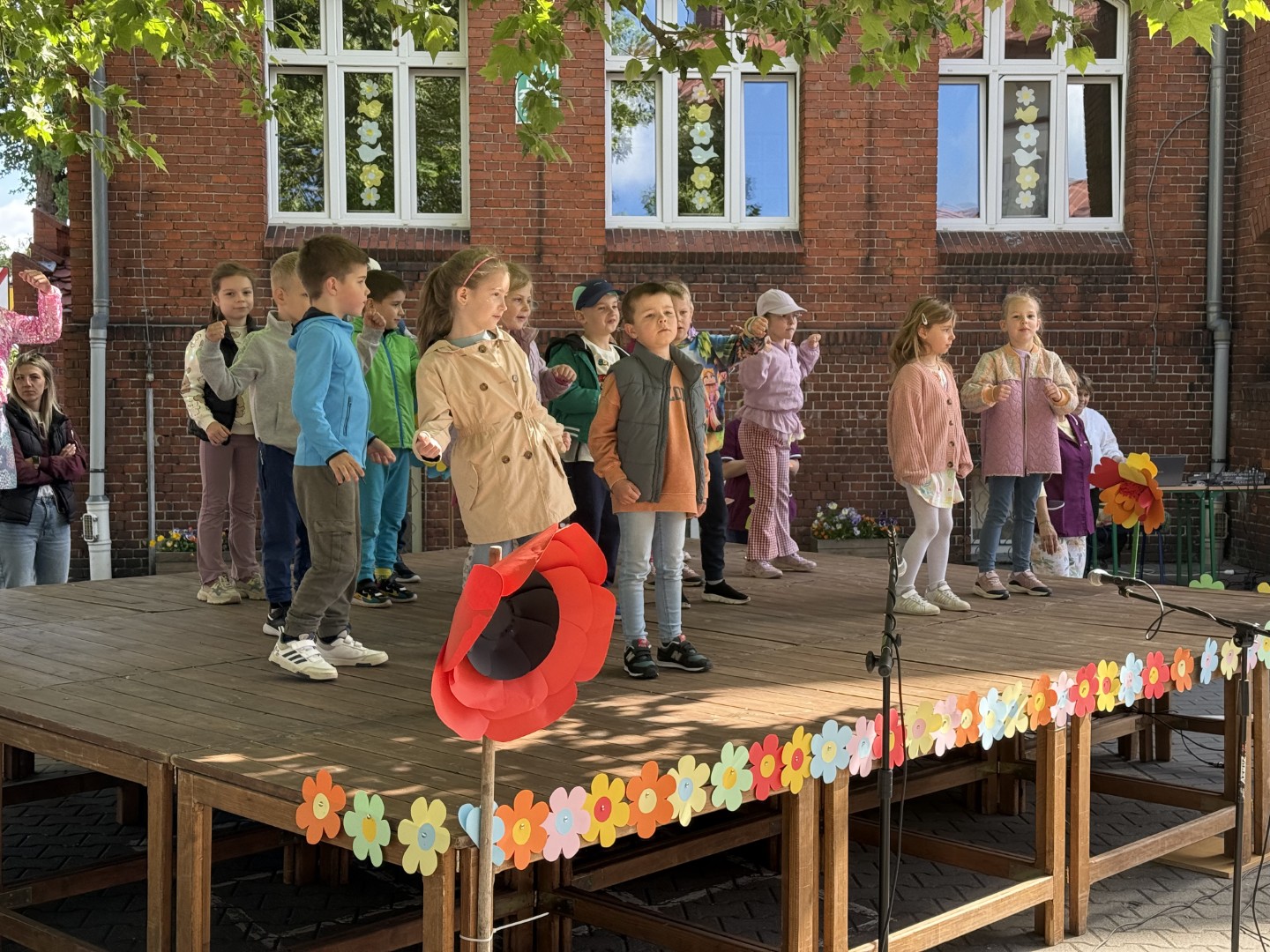 W piątek, 23.05.2025r. na podwórzu szkolnym przy Farnej pod pięknym, rozłożystym platanem stanęła scena, która stała się areną popisów wokalnych i tanecznych wszystkich klas 0-3. Zdjęcia i nagrane filmiki będą materiałem wyjściowym do stworzenia impresji filmowej – teledysku, który wkrótce sprezentujemy Rodzicom naszych Dzieci na stronie szkoły i profilu fb z okazji DNIA MAMY. Oprócz prezentacji scenicznych tego dnia Dzieci miały okazję uczestniczyć w Grze Miejskiej pod hasłem „ Opalenica w słoiku”. Zabawa polegała na znajdowaniu rozmieszczonych w ważnych miejscach naszego miasta słoików z zadaniami. Instrukcje były przeróżne i ściśle związane z odwiedzanymi miejscami. W Ratuszu np. uczniowie musieli załatwić sprawę w biurze podawczym, na Dworcu Kolejowym porozumieć się z Panią w kasie w kwestii pociągu do Warszawy. Okazało się, że policzenie okien w kościele św. Józefa było nie lada wyzwaniem, a niektórzy młodzi mieszkańcy naszego miasta pierwszy raz przechodzili przez kładkę przerzuconą przez Mogilnicę w okolicach Kolorowego Zamku. Śmiechu, zabawy, zaskoczeń było całe mnóstwo. Po powrocie do szkoły wszyscy raczyli się watą cukrową. Dziękujemy wszystkim, dzięki którym ten dzień był tak wyjątkowy.