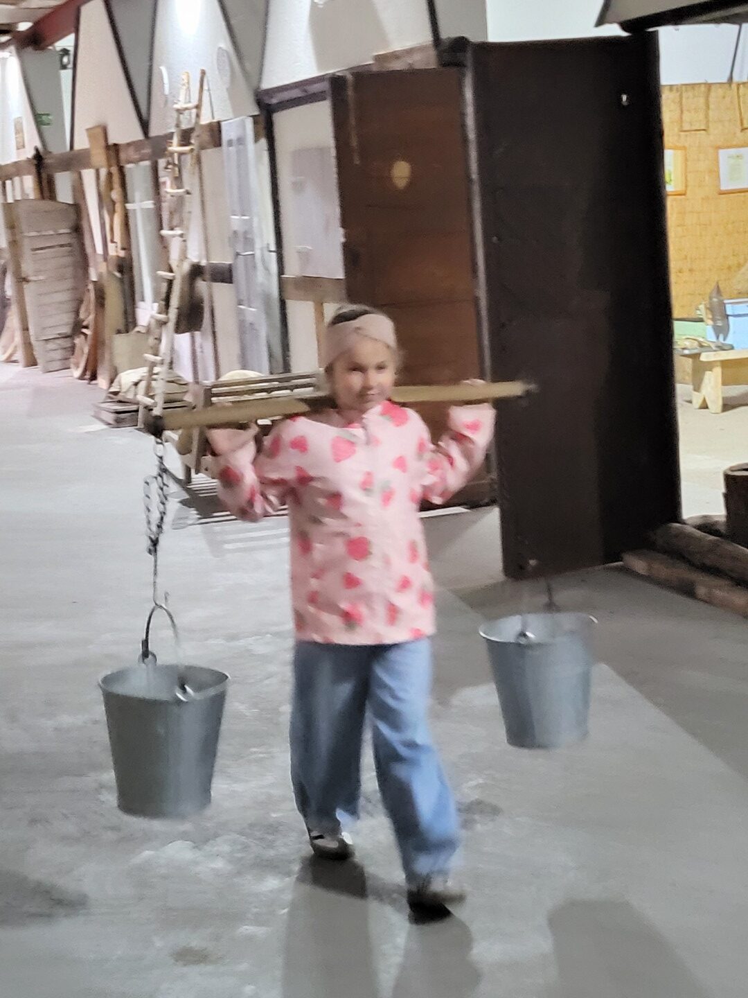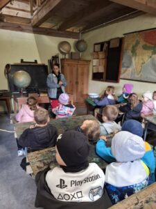Trasa zwiedzania połączona była z zajęciami edukacyjnymi, podczas których dzieci mogły spróbować kucia, przymierzyć siuńdy, popracować przy urządzeniu zwanym „kobyłką”, przyciąć skórzane rzemyki, zajrzeć do wnętrza ula, poznać duszę żelazka 🐝🔥, a także dowiedzieć się, co można było kupić w dawnym składzie kolonialnym. 🏺