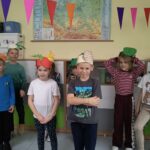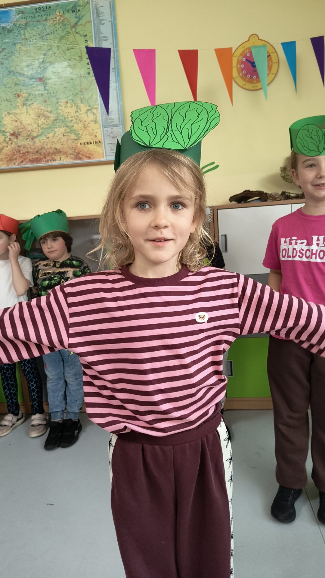 Na początku dzieci zapoznały się z wierszem, w którym warzywa toczą zabawną rozmowę na straganie. 🥬 Uczniowie z zainteresowaniem śledzili przygody pora, cebuli, kapusty i grochu, a następnie wspólnie zastanawiali się, jakie cechy mają poszczególne warzywa i o czym właściwie rozmawiały. 🍅