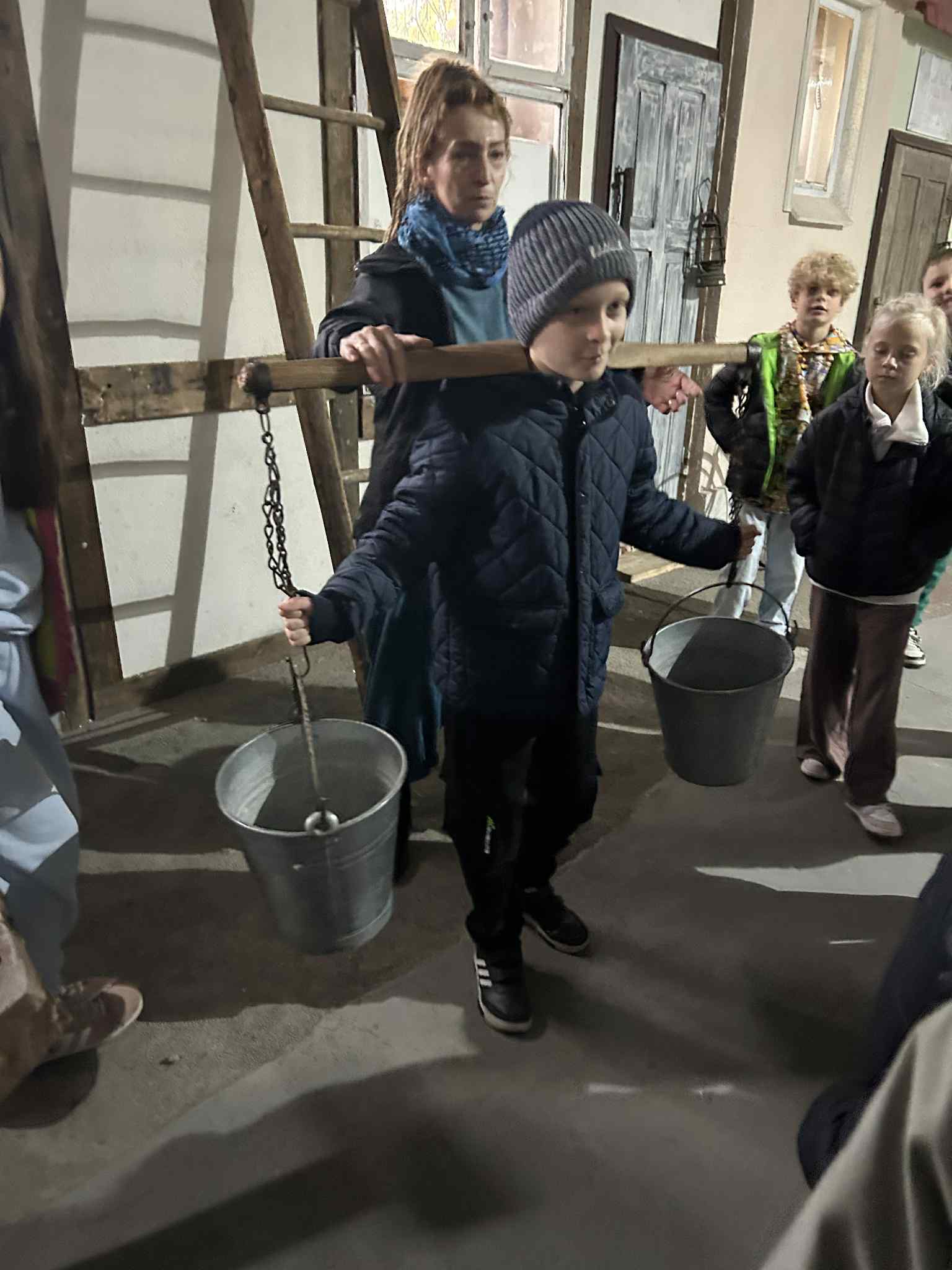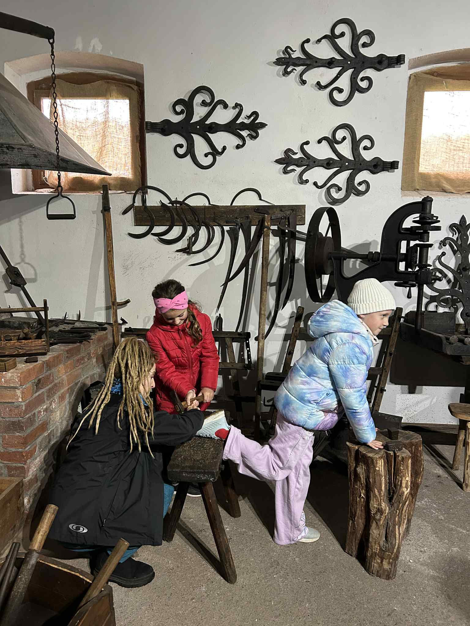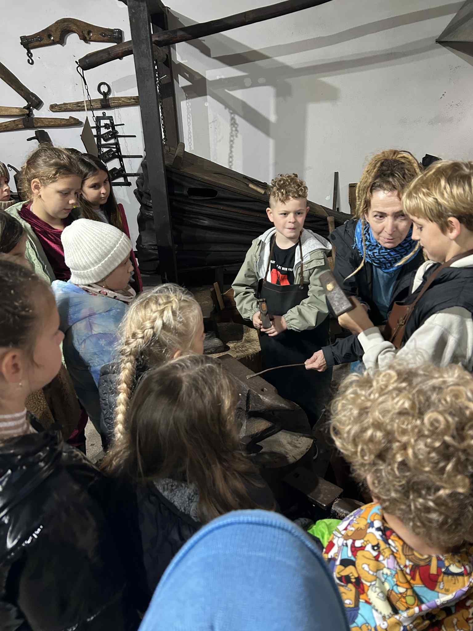 Na miejscu dzieci powitała pani przewodnik, która oprowadziła grupy po Centrum Edukacji Regionalnej i Przyrodniczej w Mniszkach. 🏡 Uczniowie dowiedzieli się, jak wyglądało życie i praca rzemieślników wiele lat temu – zobaczyli dawne warsztaty kowala, szewca, garncarza i stolarza. ⚒️