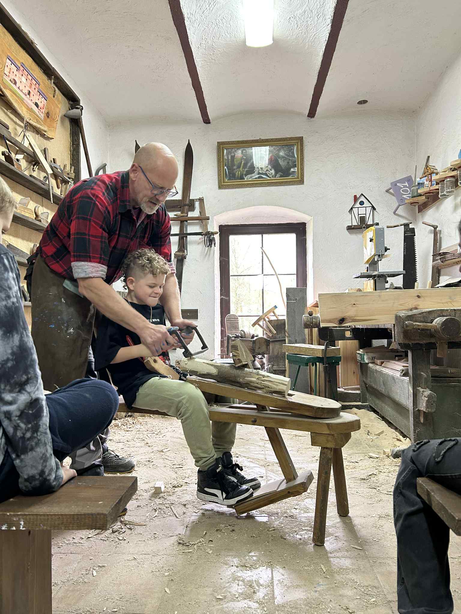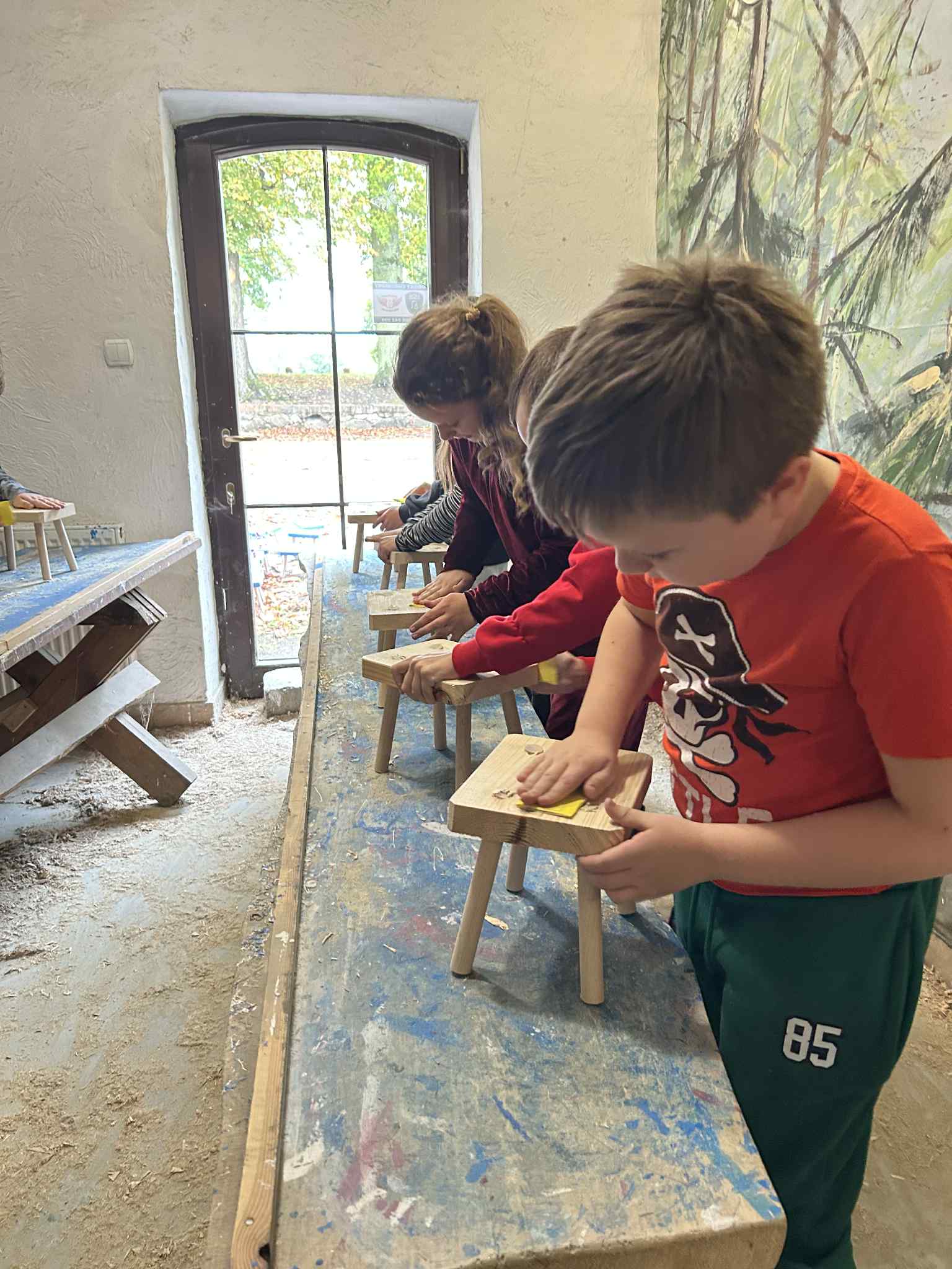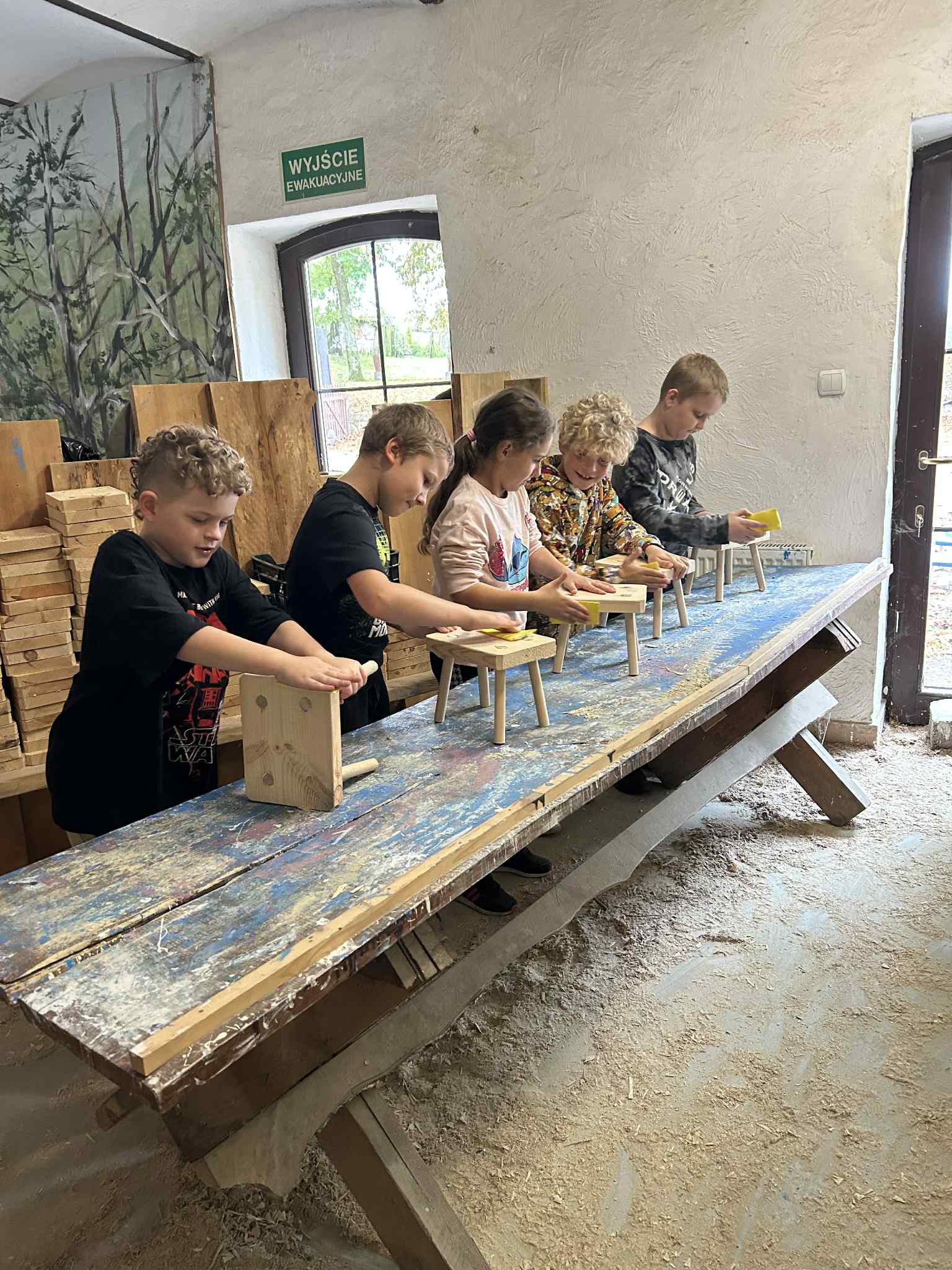 Największą atrakcją były jednak warsztaty stolarskie, podczas których każdy uczestnik mógł spróbować swoich sił w pracy z drewnem. 🌳 Pod czujnym okiem instruktorów dzieci samodzielnie złożyły i ozdobiły swoje drewniane stołki. 🎨 Praca wymagała skupienia i cierpliwości, ale efekty były imponujące – każdy uczeń zabrał do domu własnoręcznie wykonany mebel! 🪑💪
