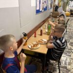 Wieczór rozpoczął się od wspólnych zabaw – nie zabrakło klasyki, takiej jak chowanego czy głuchego telefonu, a szkolne sale i korytarze wypełniły się śmiechem i radością. 😄🎈 Po intensywnej zabawie przyszedł czas na pyszną kolację – pizzę ufundowaną przez rodziców uczniów, za co serdecznie dziękujemy! 🍕💛