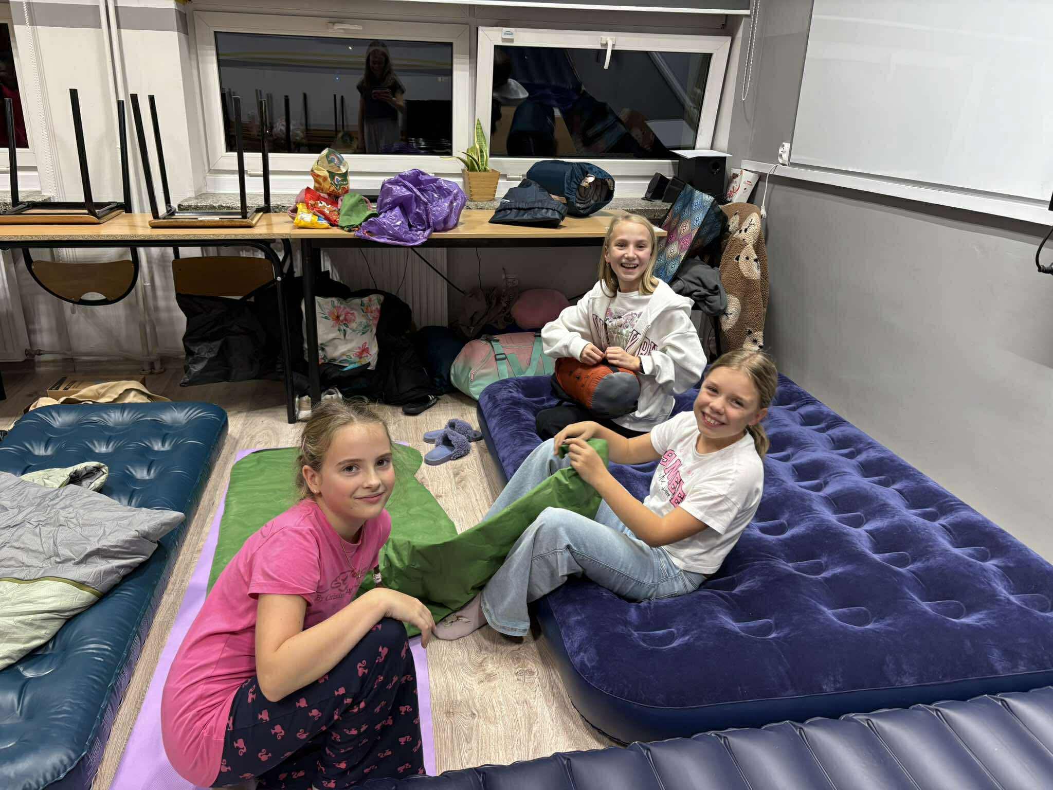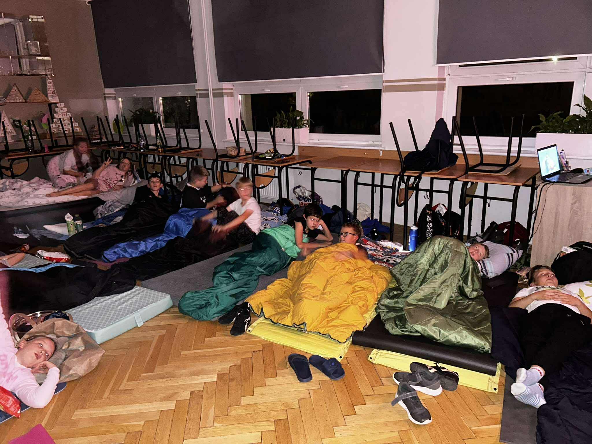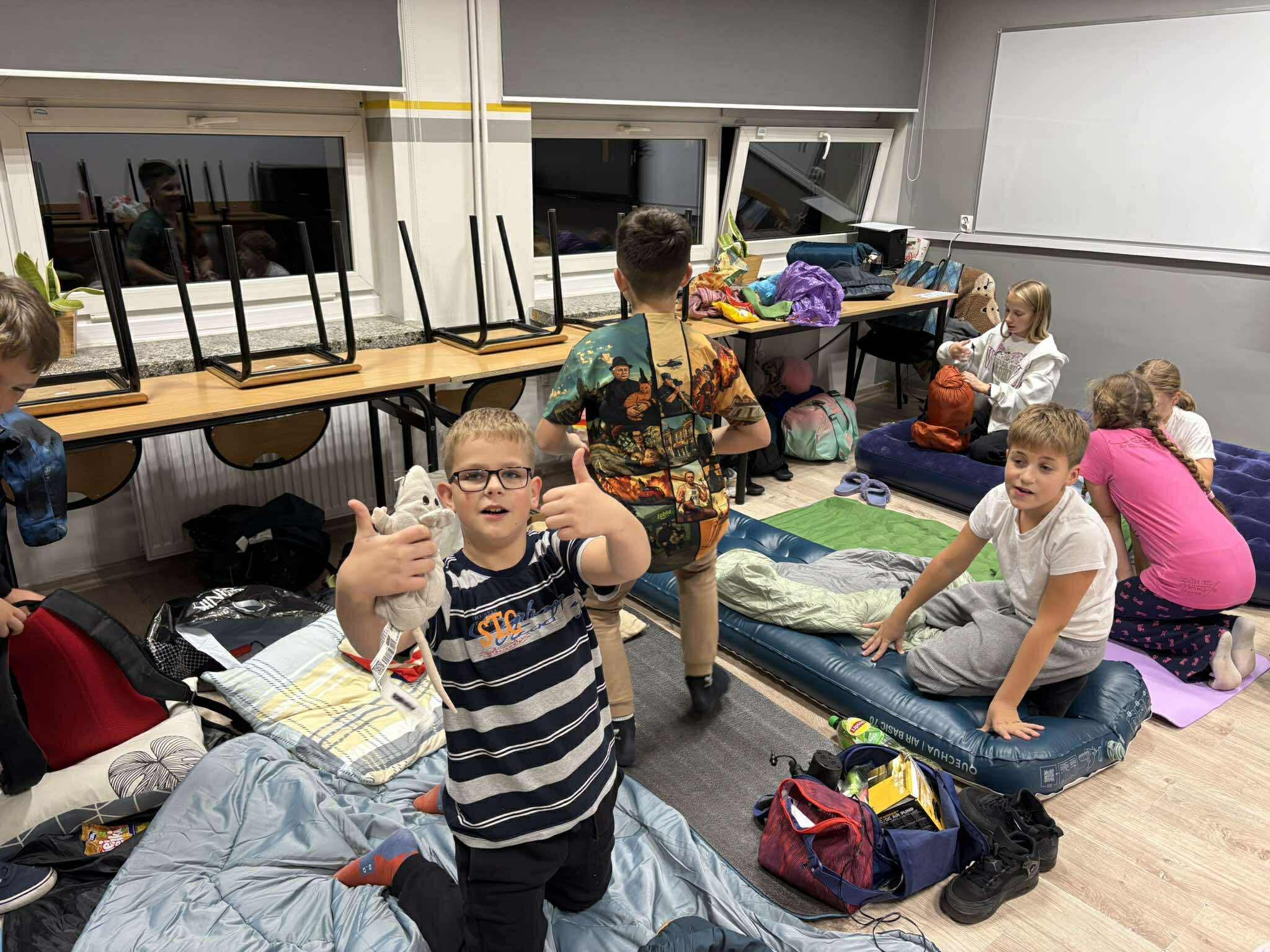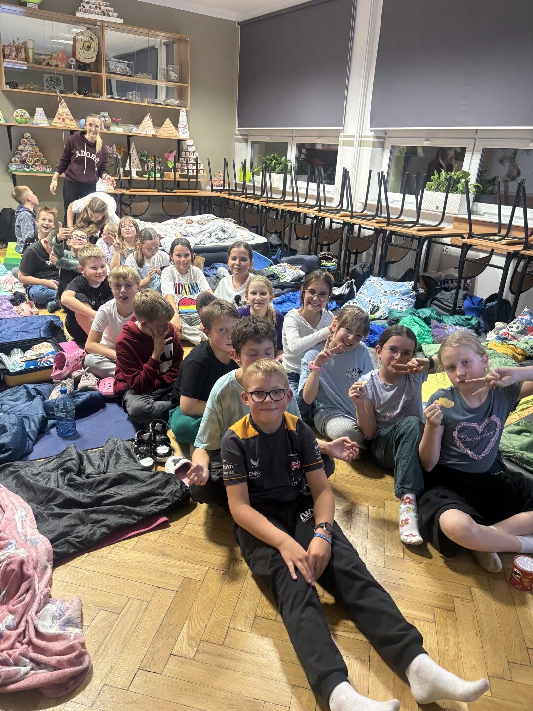 Kiedy brzuchy były już pełne, każda klasa rozgościła się w swoich „noclegowniach” i przy ciepłym świetle lampek obejrzała wspólnie film. 🎬✨ Oczywiście nie zabrakło popcornu i chrupek – bo przecież to obowiązkowy element każdej nocowanki! 🍿😋