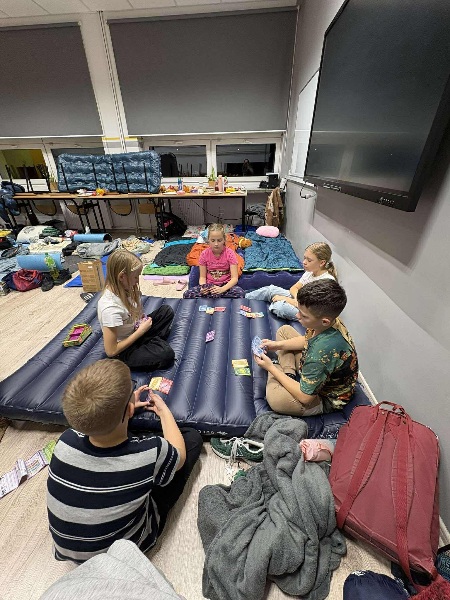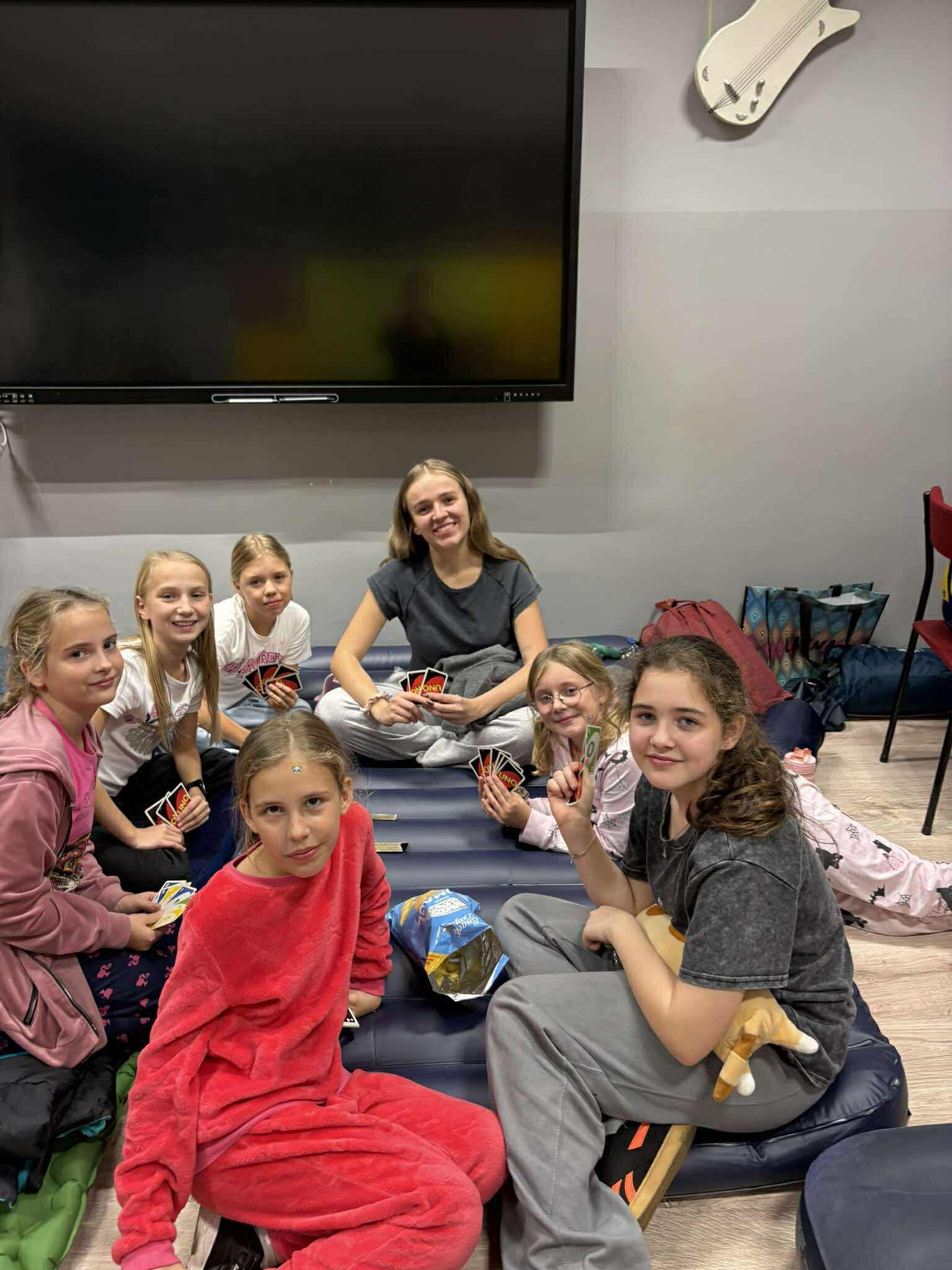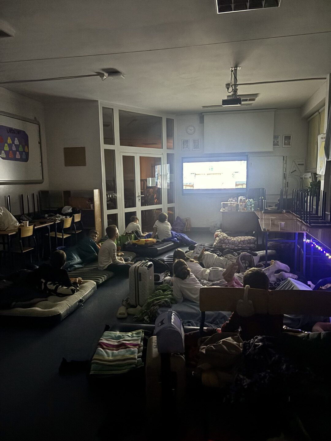 Kiedy brzuchy były już pełne, każda klasa rozgościła się w swoich „noclegowniach” i przy ciepłym świetle lampek obejrzała wspólnie film. 🎬✨ Oczywiście nie zabrakło popcornu i chrupek – bo przecież to obowiązkowy element każdej nocowanki! 🍿😋