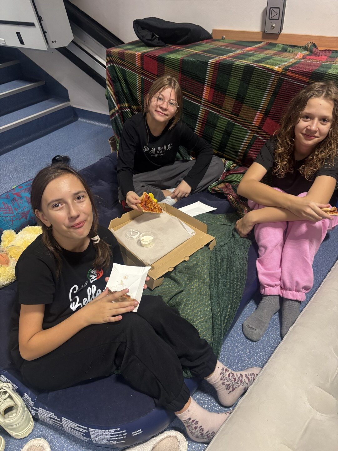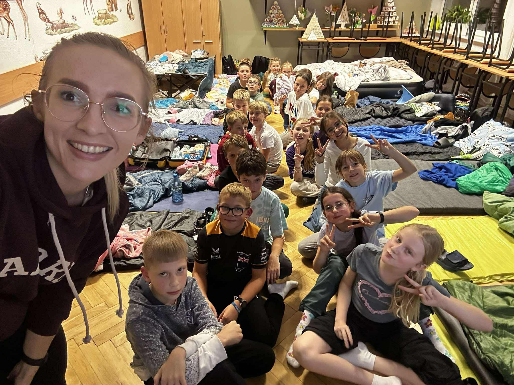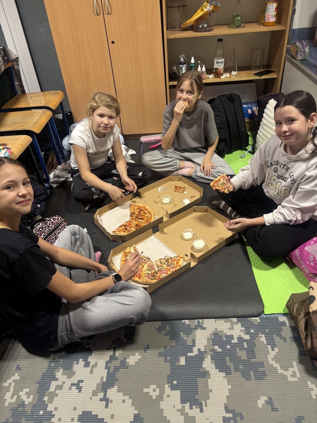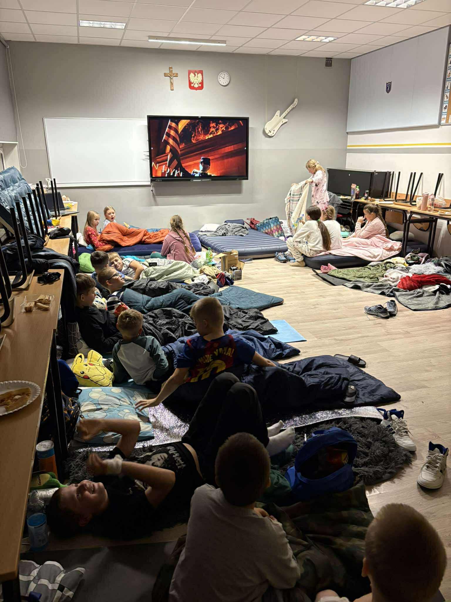 Kiedy brzuchy były już pełne, każda klasa rozgościła się w swoich „noclegowniach” i przy ciepłym świetle lampek obejrzała wspólnie film. 🎬✨ Oczywiście nie zabrakło popcornu i chrupek – bo przecież to obowiązkowy element każdej nocowanki! 🍿😋