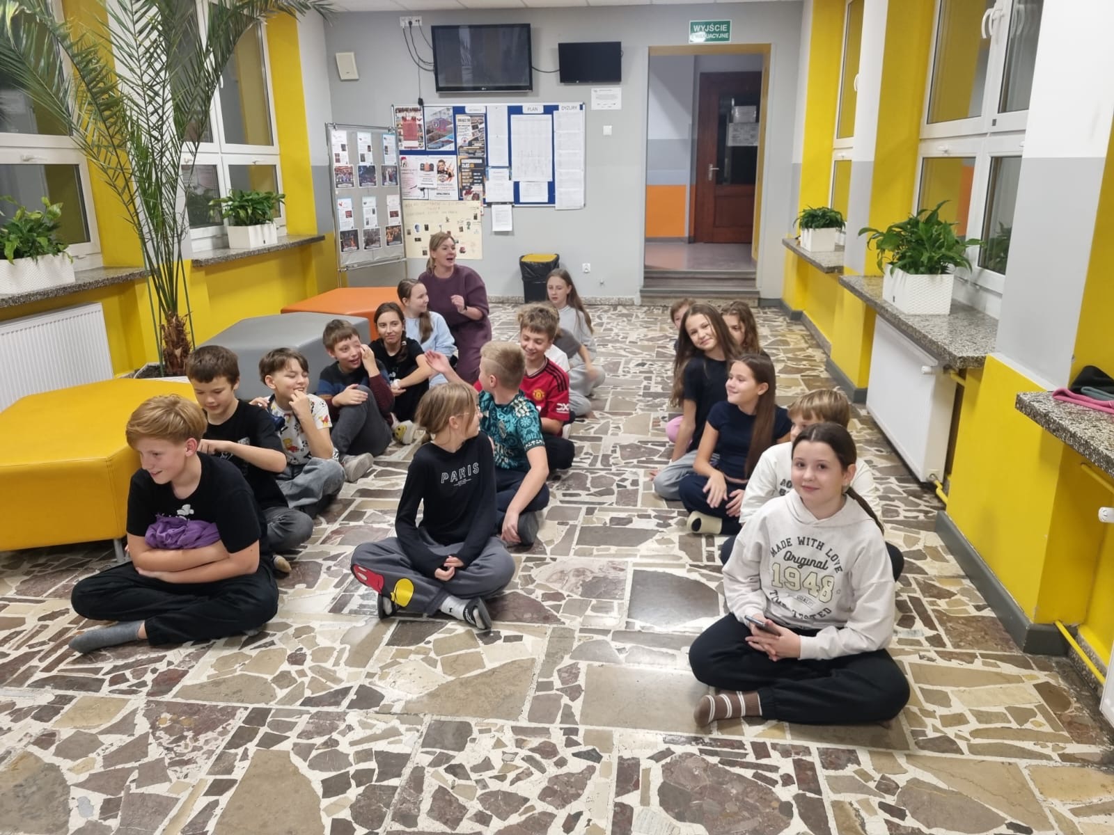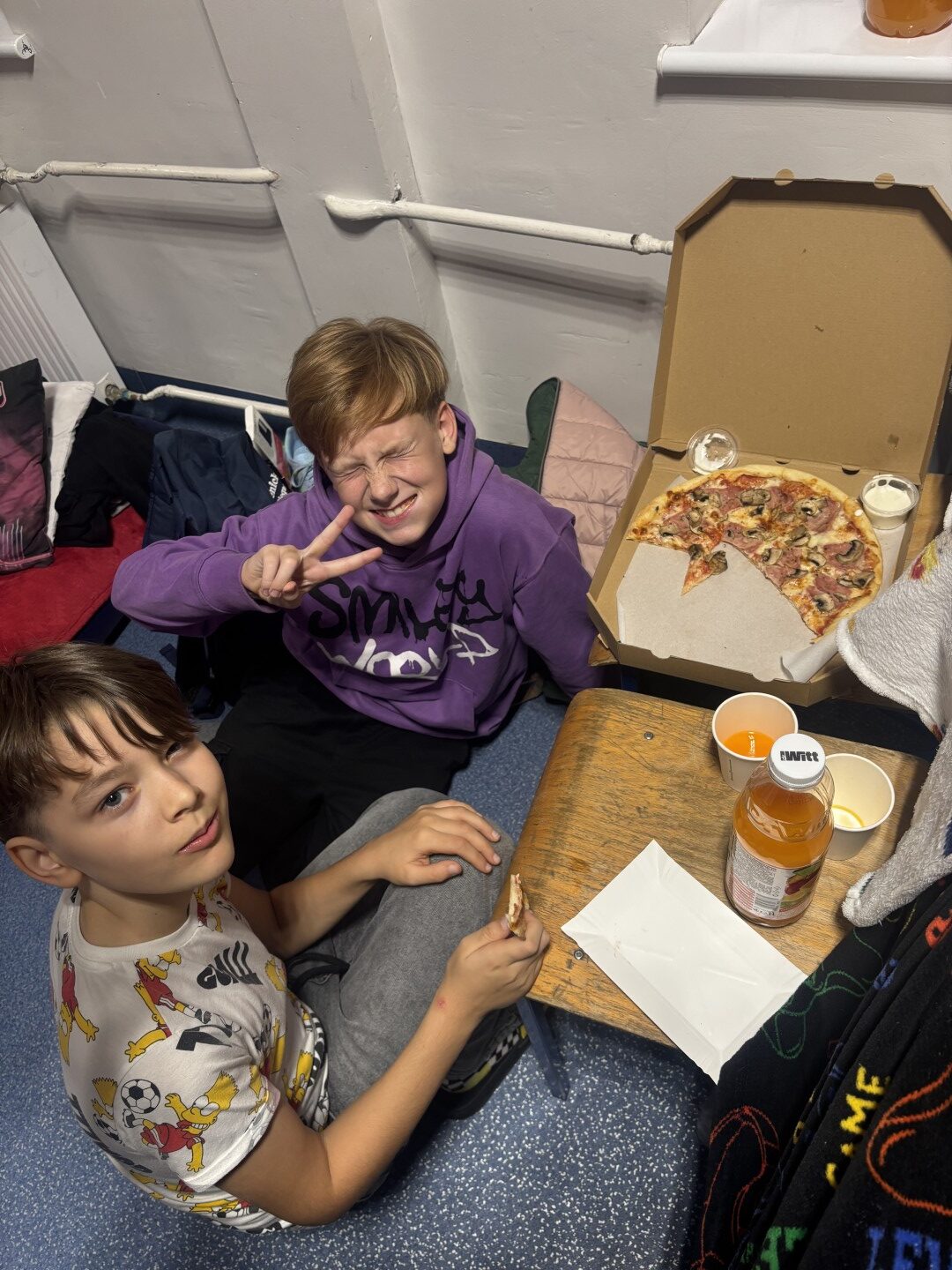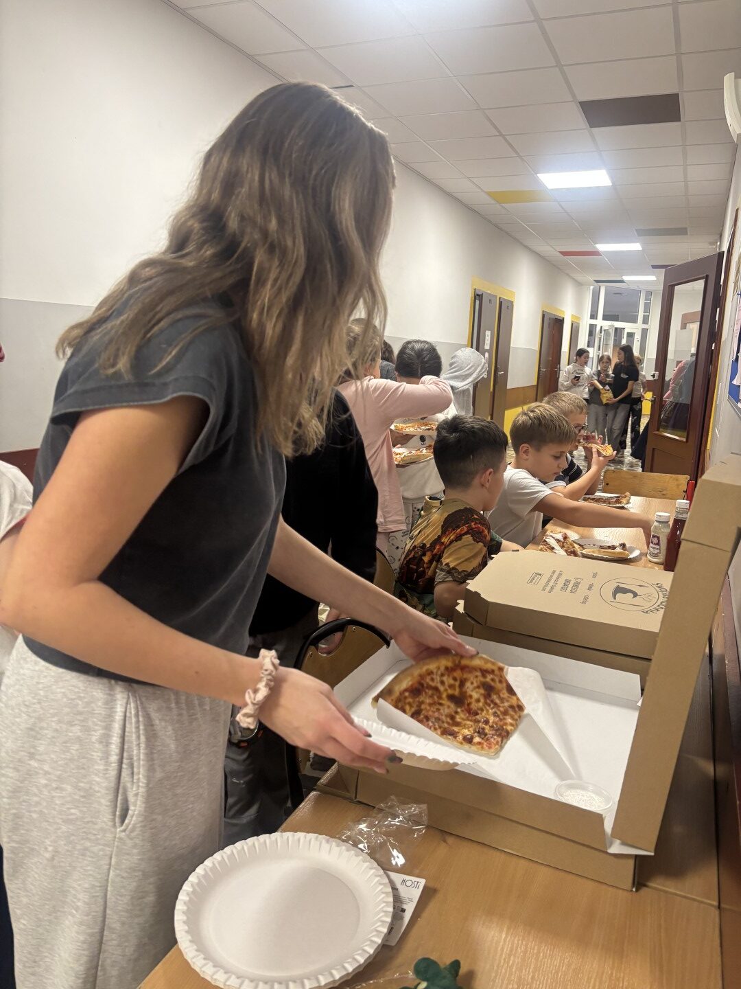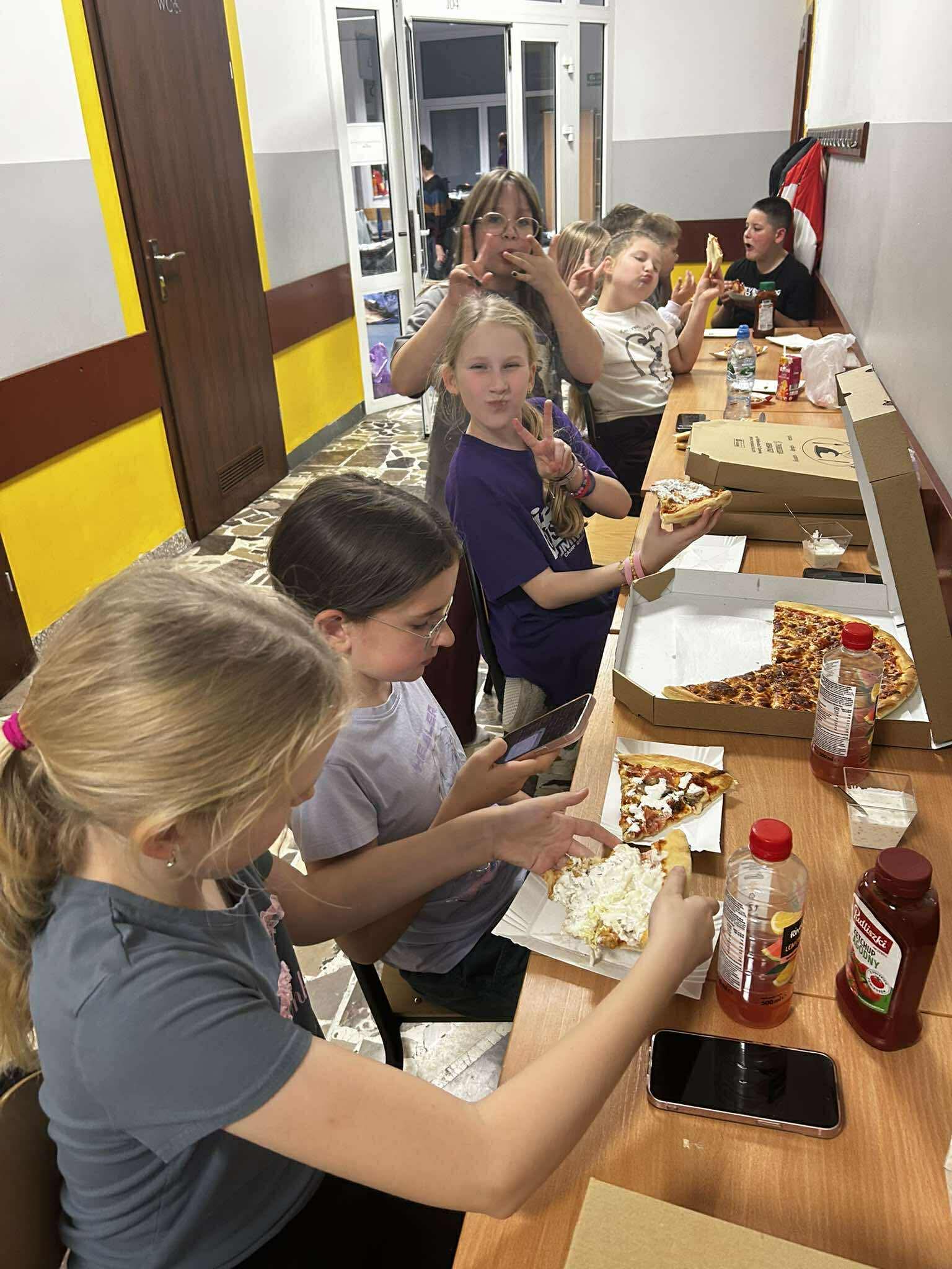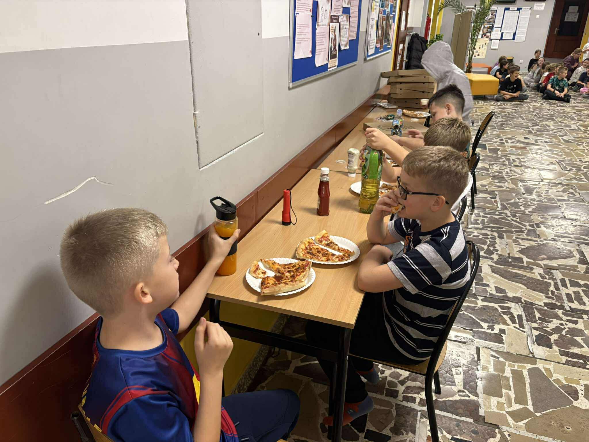 Wieczór rozpoczął się od wspólnych zabaw – nie zabrakło klasyki, takiej jak chowanego czy głuchego telefonu, a szkolne sale i korytarze wypełniły się śmiechem i radością. 😄🎈 Po intensywnej zabawie przyszedł czas na pyszną kolację – pizzę ufundowaną przez rodziców uczniów, za co serdecznie dziękujemy! 🍕💛