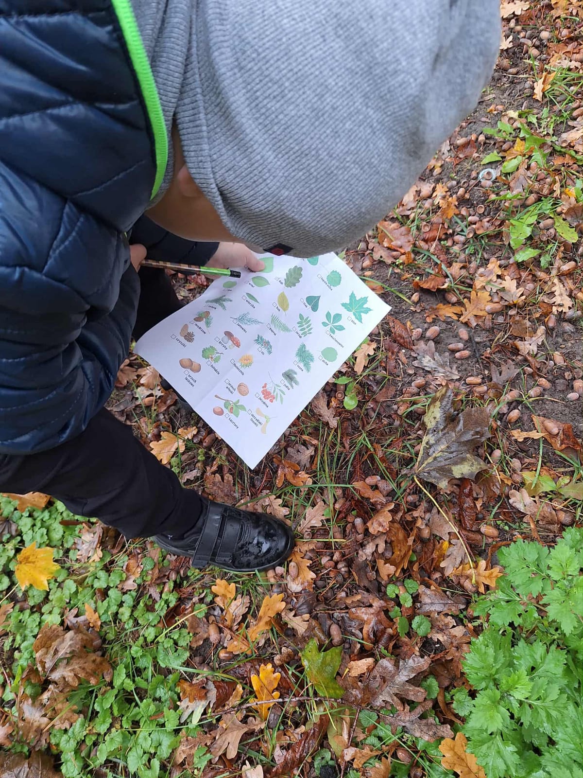 Integrując się w mniejszych i większych zespołach, uczniowie rozpoznawali liście, owoce drzew, zbierali żołędzie i kasztany. 🌳🌰 Wykonywali też jesienne zadania, ćwicząc czytanie oraz przeliczanie. 🔤➕