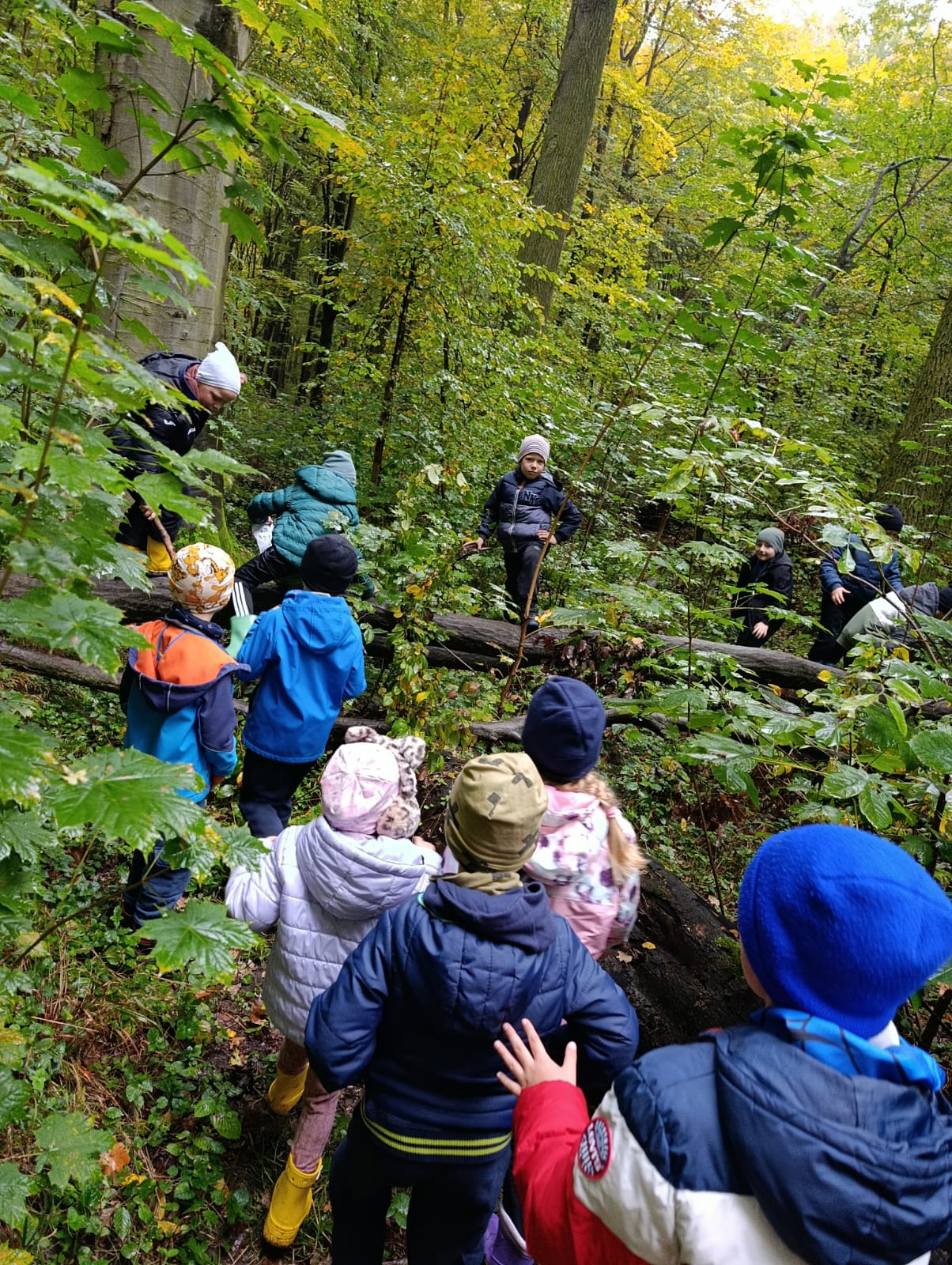 Po pysznym posiłku i zabawach na świeżym powietrzu odwiedzili pobliski las, który okazał się być pełen tajemnic i naturalnych przeszkód. 🌲🪵 Zabawy w otoczeniu przyrody są ważną i potrzebną formą spędzania szkolnego czasu — to chwile dające wytchnienie i mimochodem wyposażające w wiedzę oraz umiejętności. 🌞📚