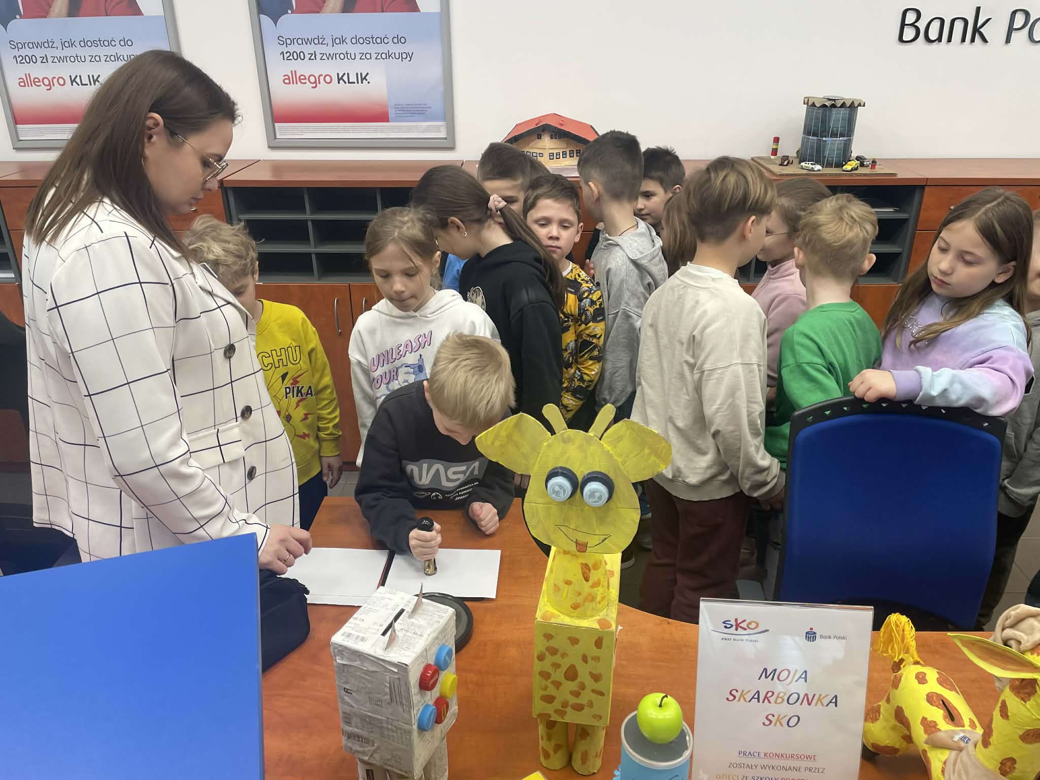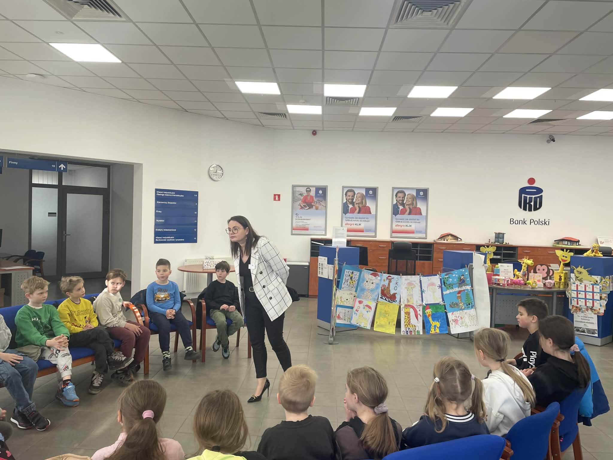 W trakcie spotkania uczniowie mieli również okazję spotkać się z Panem Dyrektorem banku 🤝. O pracy banku, zasadach oszczędzania oraz ciekawostkach związanych z funkcjonowaniem banku opowiadała dzieciom Pani Ewa, która w interesujący sposób przybliżyła uczniom świat finansów 💡.